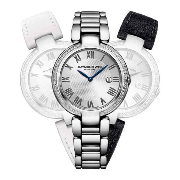 Raymond Weil Shine, naisten rannekello vaihdettavalla satiinirannekkeella ja 49 timantilla Raymond Weil Shine naisten rannekellossa on teräskuori, jota ympäröi 49 säihkyvää timanttia. Hopeanvärisessä kuvioidussa kellotaulussa on siniset osoittimet sekä päivämääränäyttö kello kolmen kohdalla. Kellon mukana tulee kaksi vaihtoranneketta, joihin teräsranneke on vaihdettavissa. Tuotenumero: 1600-STS-RE659 Kuoren materiaali: ruostumaton teräsKuoren väri: teräksenharmaaKuoren koko: 32 mmKellon paksuus: 8,63 mmRanneke: ruostumatonta terästä, mukana kaksi vaihtoranneketta, musta ja vaaleanpunainenKellotaulun väri: hopea, timanttejaTimantteja: 49 kpl, yhteensä 0.27 ctSafiirilasiPäivämääränäyttöVesitiiviys: 50 mKoneisto: kvartsi