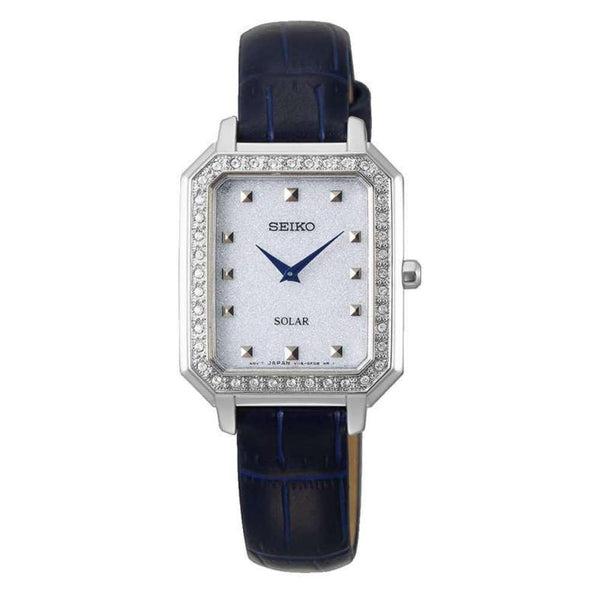 Seiko Solar naisten rannekello Mallinumero: SUP429P1Mallisto: SeikoKellon materiaali: teräsKellotaulun leveys: 24,7 mmKellotaulun väri: helmiäinenRanneke: musta nahkarannekeVesitiiviys: 30 mLasi: hardlex lasiKoneisto: solar40 Swarovski kiveä Kaikkiin Seiko-rannekelloihin myönnetään 2 vuoden takuu ja ne toimitetaan alkuperäisessä Seiko-kotelossa. Katso koko Seiko-mallisto täältä.