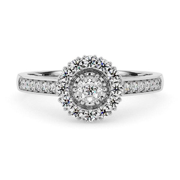 Näyttävä halo-mallinen timanttisormus valkokultaisena Materiaali: 14 KA valkokultaRungon profiili: FlakkaTimantit: 1 x 0,18ct + 12 x 0,02ct + 12 x 0,01ctTimantit yhteensä: 0,54ctTimanttien puhtaus: VVSTimanttien väri: HTimanttien hionta: BrilliantTimanttikorun aitoustodistus: KylläTuotenumero: 23862854VK