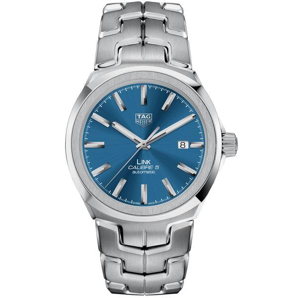 TAG Heuer Link Calibre 5 Automatic, miesten rannekello- tuotenumero: WBC2112.BA0603 – rungon materiaali: ruostumaton teräs – rungon väri: hopea – rannekkeen materiaali: ruostumaton teräs – rannekkeen väri: hopea – kellotaulun väri: sininen – kellotaulun leveys: 41 mm- safiirilasi – päivämääränäyttö – vesitiiviys: 100 m – automaattirannekello – käyntivara: 38 tuntia