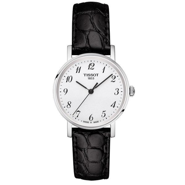 Tissot Everytime, naisten rannekello Mallinumero: T109.210.16.032.00Rungon materiaali: ruostumaton teräsRannekkeen materiaali: nahkaRannekkeen väri: mustaKellotaulun väri: valkoinenSafiirilasiPaino: 25 gKellotaulun paksuus: 6,2 mmKellotaulun leveys: 30 mmVesitiiviys: 30 metriä (3 bar)Kvartsikello