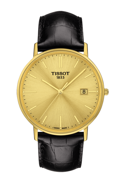 Tissot Goldrun 18K miesten rannekello Tissot Goldrun on yksi tunnetuimmista perinteisistä kultakelloista. Se on ajaton ja klassinen ja viimeistelty pieniä yksityiskohtia myöden. Tissot Goldrun kellot sopivat hyvin myös yrityslahjoiksi! Mallinumero: T922.410.16.021.0018 karaatin keltakultaRannekkeen materiaali: musta nahkaSafiirilasiKellotaulun paksuus: 4,9 mmKellotaulun leveys: 38 mmKellon paino: 39 gVesitiiviys: 30 metriä (3 bar, roiskesuojattu)PäivyriKvartsikoneisto