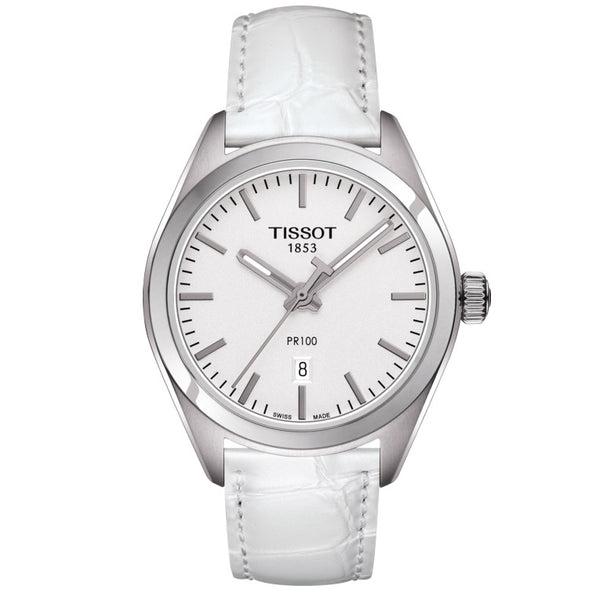 Tissot PR 100 Lady naisten rannekello Mallinumero: T101.210.16.031.00Rungon materiaali: ruostumaton teräs Rungon väri: hopeaRannekkeen materiaali: nahkaRannekkeen väri: valkoinenSafiirilasiPaino: 41 gKellotaulun paksuus: 9 mmKellotaulun leveys: 33 mmVesitiiviys: 100 metriä (10 bar)PäivyriKvartsikello