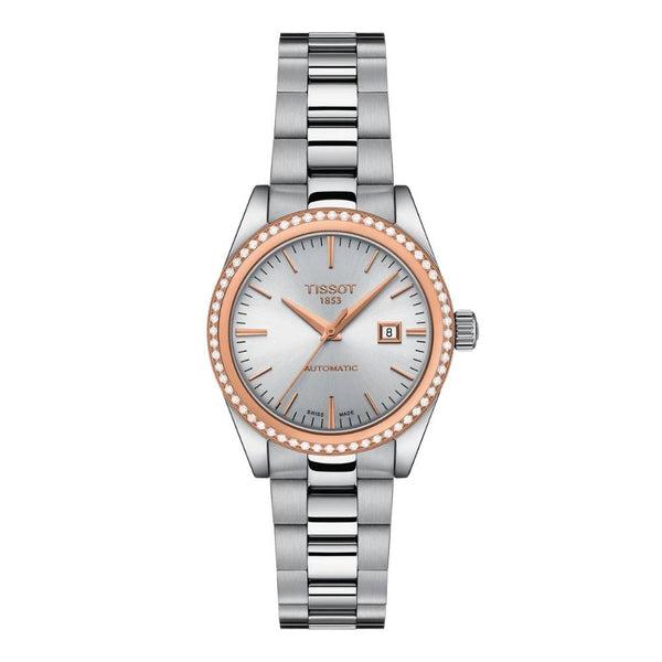 Tissot T-My Lady Automatic 18K rosekulta T930.007.41.031.00, naisten automaattirannekello Mallinumero: T930.007.41.031.00 Koneisto: automaatti (Powermatic 48, käyntivara jopa 48h)Rungon materiaali: ruostumaton teräs, 18K rosekulta bezel Rannekkeen materiaali: ruostumaton teräsRannekkeen väri: teräksenharmaaSafiirilasiKellotaulun väri: hopeaKellon rungon timantit: 60 kpl Top Wesselton VS-SI, 0,39ctKellotaulun leveys: 29,0 mmKellotaulun paksuus: 10,4 mmPaino: 84 gVesitiiviys: 50 metriä (5 bar)Päivyri Katso täältä verkkokauppamme koko Tissot-valikoima!