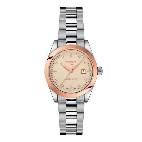 Tissot T-My Lady Automatic 18K rosekulta T930.007.41.266.00, naisten automaattirannekello Mallinumero: T930.007.41.266.00 Koneisto: automaatti (Powermatic 48, käyntivara jopa 48h)Rungon materiaali: ruostumaton teräs, 18K rosekulta bezel Rannekkeen materiaali: ruostumaton teräsRannekkeen väri: teräksenharmaaSafiirilasiKellotaulun väri: kermanvaaleaKellotaulun timantit: 8kpl Top Wesselton VS-SI, 0,0160ctKellotaulun leveys: 29,0 mmKellotaulun paksuus: 10,4 mmPaino: 81 gVesitiiviys: 50 metriä (5 bar)Päivyri Katso täältä verkkokauppamme koko Tissot-valikoima!