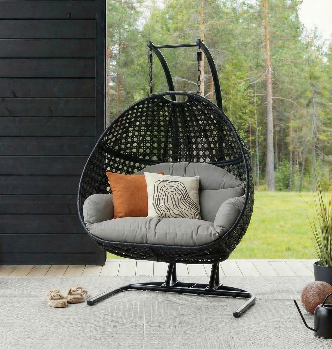 Mukavaan oleskeluun Usva kahden istuttava riipputuoli ja teline. Tässä riipputuolissa on tukeva rakenne, joka on suunniteltu kestämään kahden aikuisen keinumista. Sisältää kuvan muhkeat pehmusteet, jotka on verhoiltu vettähylkivällä polyester kankaalla. Pehmusteet eivät ole vedenpitäviä, joten ne tulee säilyttää sateelta suojassa. Istuinkorkeus on säädettävissä sopivaan korkeuteen kettinkien avulla. Jalkaosan leves on 136 cm ja runkoputken halkaisija on 4 cm. Jalkaosa ja riipputuoli toimitetaan osissa. Tuote toimitetaan erikoisvahvassa puulaatikossa, joka suojaa sitä kuljetuksen aikana. Huomioithan, että pakkauksen avaaminen vaatii hieman enemmän työtä kuin tavallisen pahvilaatikon.