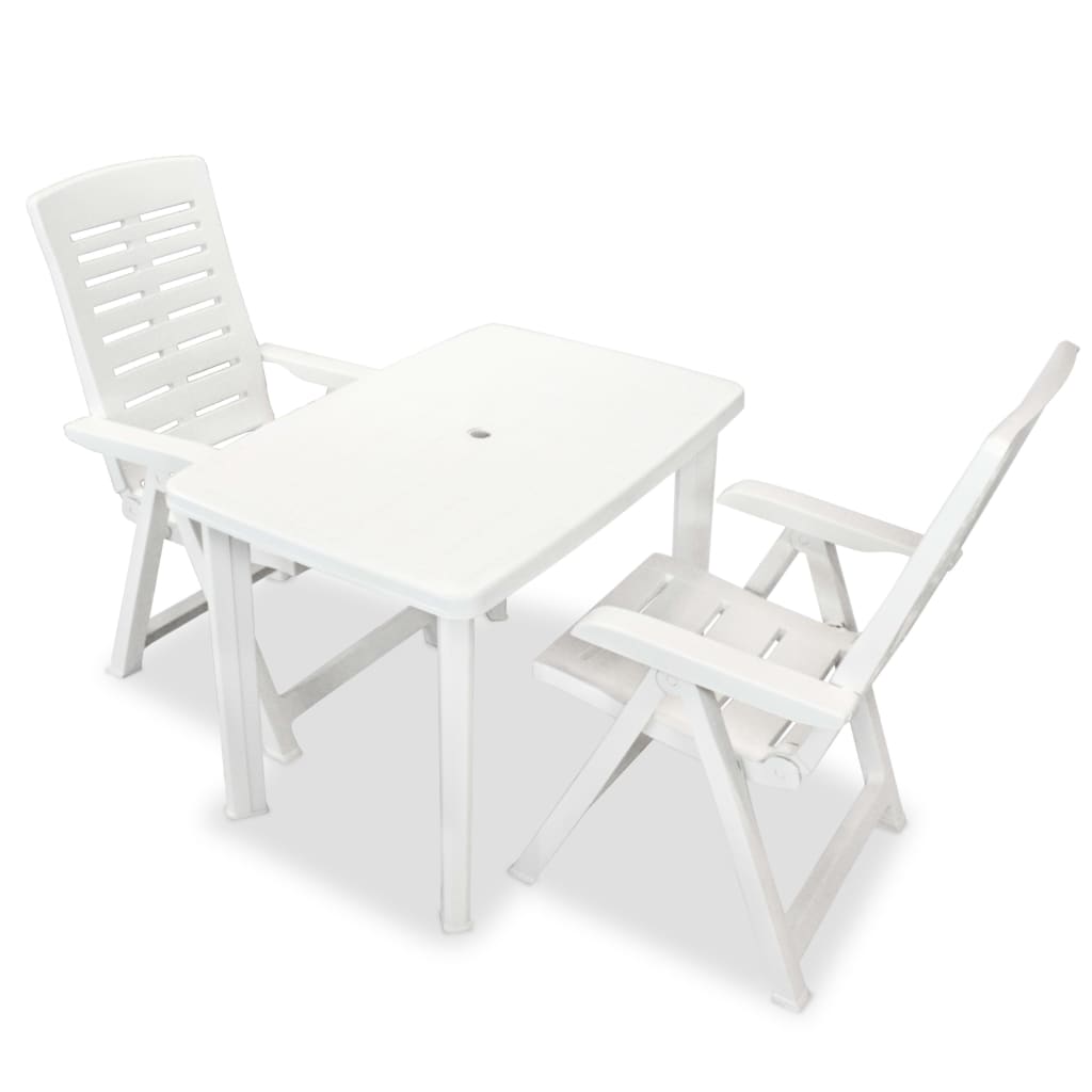 Tämä säänkestävä bistrosarja on upea valinta al fresco ruokailuun puutarhassa, terassilla tai leirillä. Puutarhapöydässä on reikä aurinkovarjolle, jotta voit käyttää sitä yhdessä varjon kanssa pysyen varjossa. Tuolien selkänojissa on 4 kallistusasetusta, joten voit siis aina löytää mukavimman mahdollisen asennon. Tuolit voidaan taittaa kokoon, jotta säästät tilaa, kun niitä ei käytetä. Sarja on valmistettu kestävästä muovista, mikä tekee pöydästä ja tuoleista säänkestävät ja helpot puhdistaa. Ulkoruokailuryhmä on myös kevyt, joten sitä on helppo siirrellä. Toimituksessa mukana 1 pöytä ja 2 kokoontaitettavaa tuolia. Väri: valkoinen Materiaali: muovi Säänkestävä Pöytä: Mitat: 101 x 68 x 72 cm (P x L x K) Pöydän keskellä halkaisijaltaan 3,6 cm reikä aurinkovarjolle. Helppo koota Tuoli: Mitat: 60 x 61 x 108 cm (P x L x K) Istuimen leveys: 45 cm Istuimen syvyys: 49,5 cm Istuimen korkeus maasta: 44 cm Käsinojan korkeus: 63 cm 4 kallistusasentoa Taittuu kokoon kuljetuksen helpottamiseksi Toimitus sisältää 1 x pöytä ja 2 x kokoonataittuva tuoli