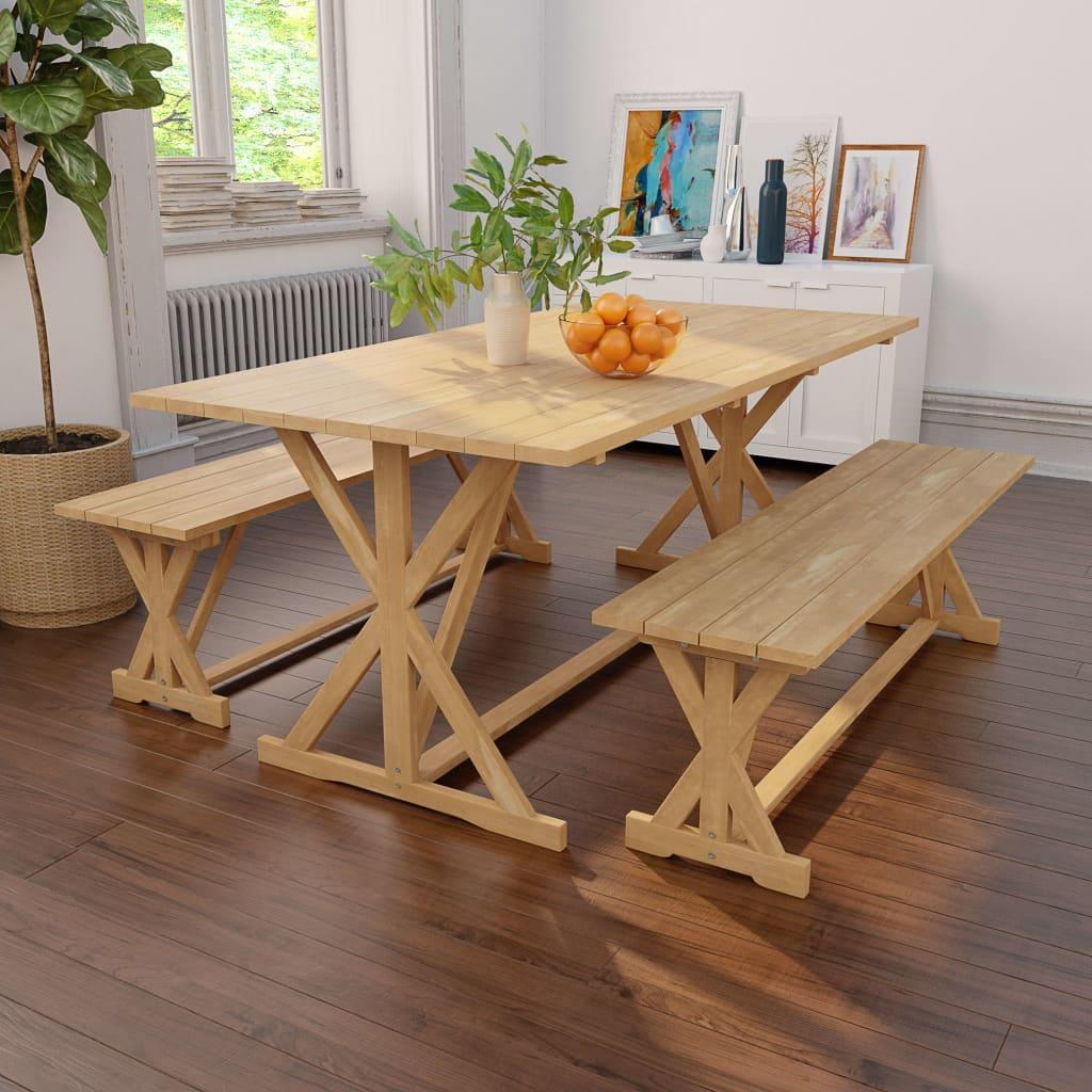 Tämä täysi tiikkinen ruokaryhmä, jossa on 1 pöytä ja 2 penkkiä, on upea lisä puutarhaan, terassille tai parvekkeelle! Tämä ulkoruokailuryhmä on valmistettu vahvasta ja kestävästä tiikistä, joka antaa sille lujan rakenteen. Huolellisesti hiottu viimeistely tuo pöydälle ja penkeille tyylikkään ilmeen ja tekee siitä helpon puhdistaa. Ainutlaatuinen X-runko tuo oman lisänsä huonekalujen karkeaan tyyliin. Suuri ruokapöytä ja penkit ovat ihanteellinen paikka ulkoilmaillalliselle ystävien ja perheen kanssa. Toimitus sisältää 1 pöydän ja 2 penkkiä. Tuote vaati kokoamisen. Väri: ruskea Materiaali: täysi tiikki hiotulla pinnalla Pöydän mitat: 180 x 90 x 75 cm (P x L x K) Penkin mitat: 150 x 35 x 45 cm (L x S x K) Toimitus sisältää 1 pöydän ja 2 penkkiä