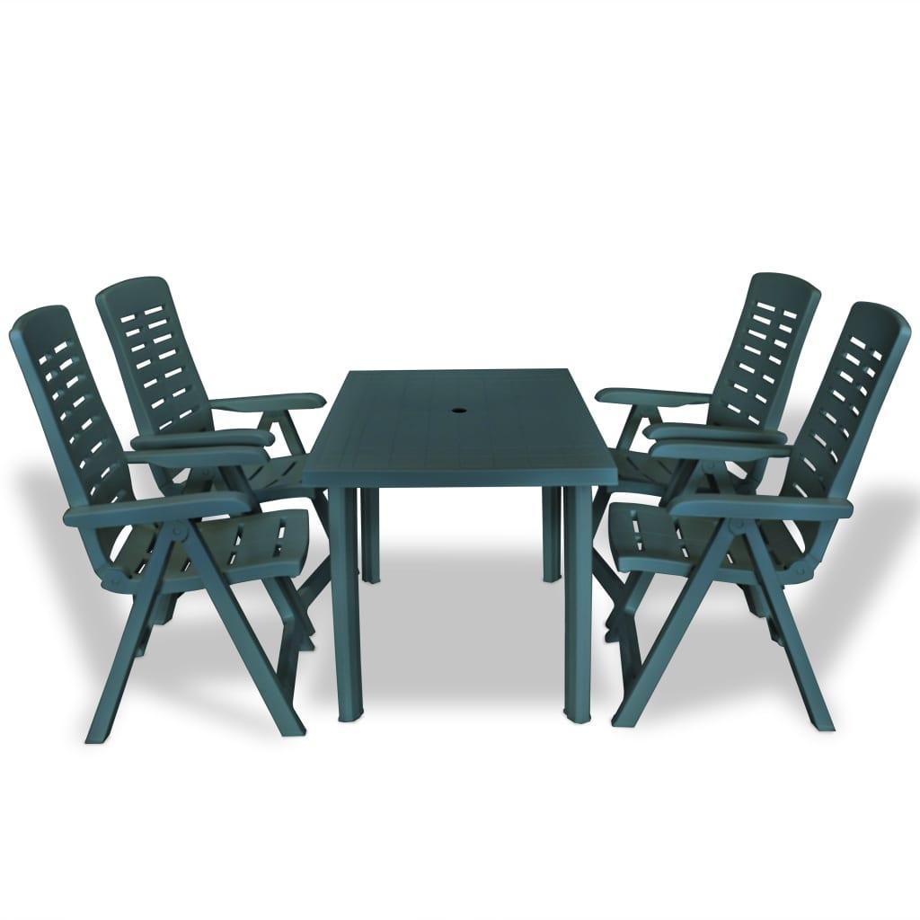 Tämä säänkestävä ulkotilan ruokailuryhmä on upea valinta ulkona puutarhassa, terassilla tai leirintäalueella ruokailuun. Puutarhapöydässä on reikä aurinkovarjolle, jotta voit käyttää sitä yhdessä varjon kanssa pysyen varjossa. Tuolien selkänojissa on 4 kallistusasetusta, joten voit siis aina löytää mukavimman mahdollisen asennon. Tuolit voidaan taittaa kokoon, jotta säästät tilaa, kun niitä ei käytetä. Sarja on valmistettu kestävästä muovista, mikä tekee pöydästä ja tuoleista säänkestävät ja helpot puhdistaa. Ulkoruokailuryhmä on myös kevyt, joten sitä on helppo siirrellä. Toimituksessa mukana 1 pöytä ja 4 kokoontaitettavaa tuolia. Väri: vihreä Materiaali: muovi Säänkestävä Pöytä: Mitat: 126 x 76 x 72 cm (P x L x K) Pöydän keskellä halkaisijaltaan 3,6 cm reikä aurinkovarjolle. Helppo koota Tuoli: Mitat: 60 x 61 x 108 cm (P x L x K) Istuimen leveys: 45 cm Istuimen syvyys: 49,5 cm Istuimen korkeus maasta: 44 cm Käsinojan korkeus: 63 cm 4 kallistusasentoa Taittuu kokoon kuljetuksen helpottamiseksi Toimitus sisältää 1 x pöytä ja 4 x kokoonataittuva tuoli