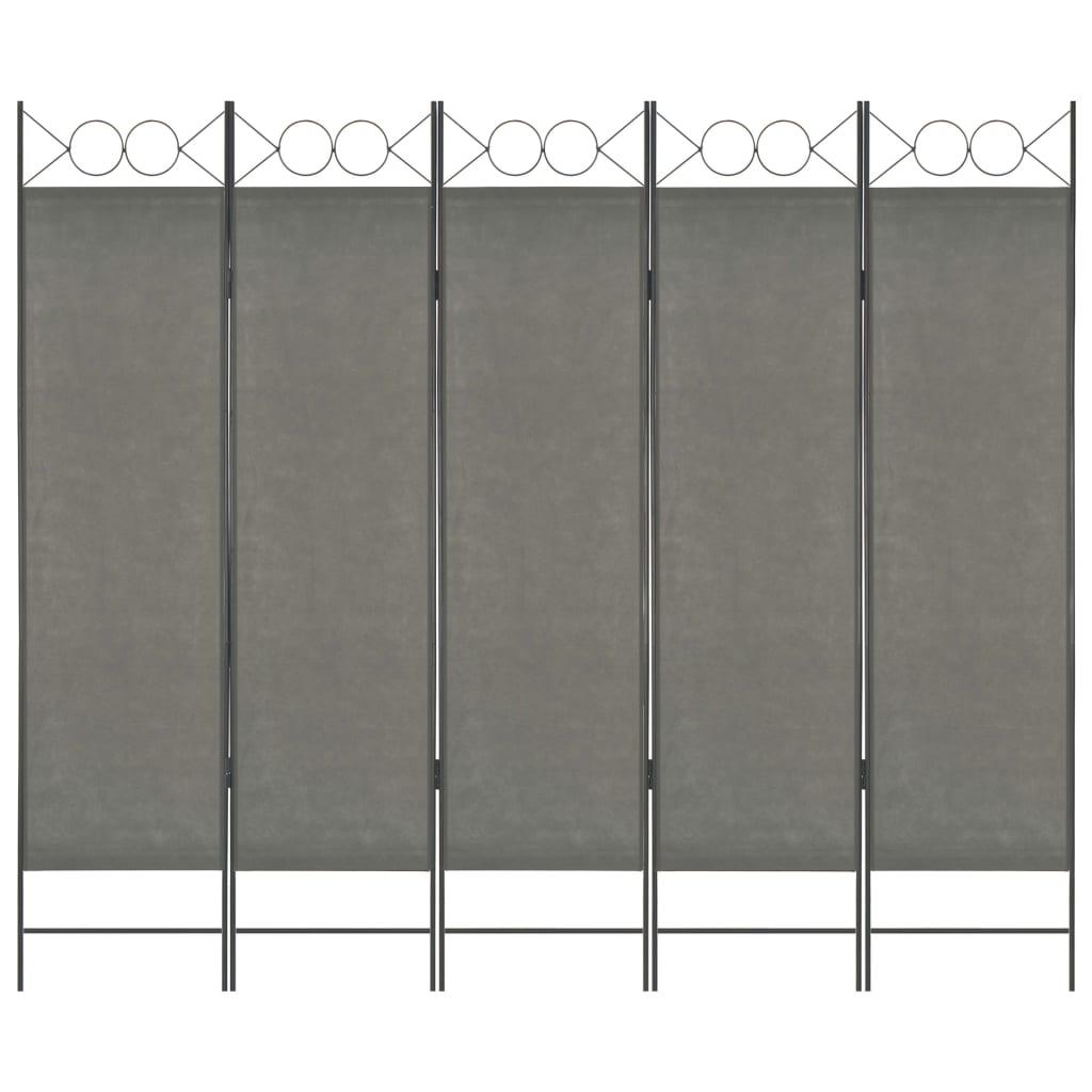 Itsestään seisovaa ja käytännöllistä 5-paneelista tilanjakajaa voidaan käyttää koristeeksi tai väliseinänä. Voit laittaa sen makuuhuoneeseen luomaan erillisen pukeutumisalueen tai jakaaksesi huoneen tilan kahtia. Yläosan ympyrämuotoilu lisää tuotteen eleganssia. Lisäksi tilanjakaja, jossa on jauhemaalattu teräsrunko ja tekstiilisermi, voidaan helposti taittaa ylös, kun sitä ei käytetä. Huomio: Kangas ei täysin estä kaikkea valoa. Väri: antrasiitti Materiaali: kangas ja jauhemaalattu teräs Koko: 200 x 180 cm (P x K) 5 paneelia Yläosa ympyrämuotoilulla Tekstiili: Polyesteri: 100%
