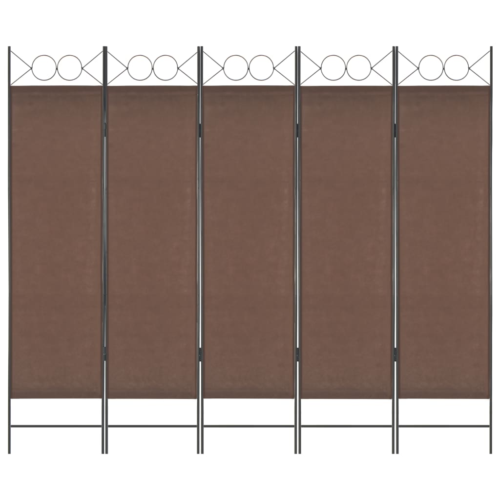 Itsestään seisovaa ja käytännöllistä 5-paneelista tilanjakajaa voidaan käyttää koristeeksi tai väliseinänä. Voit laittaa sen makuuhuoneeseen luomaan erillisen pukeutumisalueen tai jakaaksesi huoneen tilan kahtia. Yläosan ympyrämuotoilu lisää tuotteen eleganssia. Lisäksi tilanjakaja, jossa on jauhemaalattu teräsrunko ja tekstiilisermi, voidaan helposti taittaa ylös, kun sitä ei käytetä. Huomio: Kangas ei täysin estä kaikkea valoa. Väri: ruskea Materiaali: kangas ja jauhemaalattu teräs Koko: 200 x 180 cm (P x K) 5 paneelia Yläosa ympyrämuotoilulla Tekstiili: Polyesteri: 100%