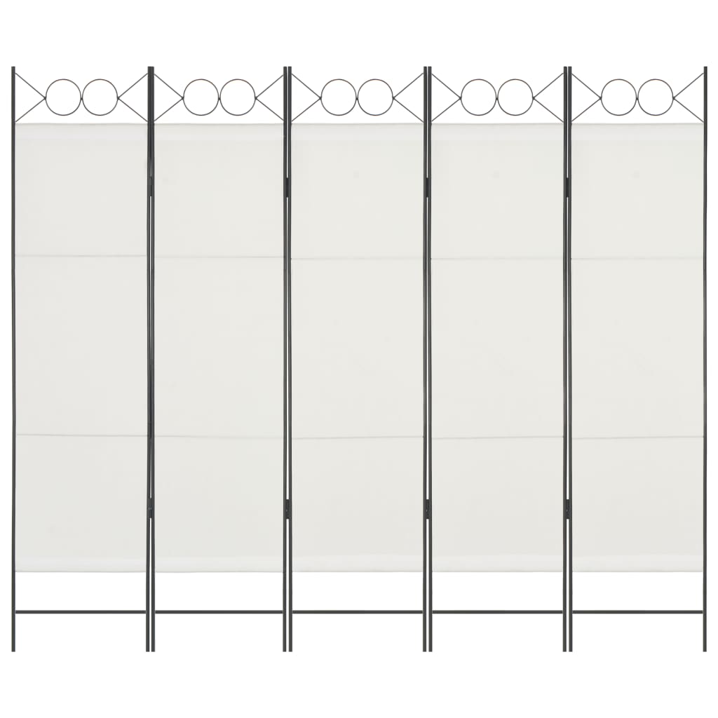 Itsestään seisovaa ja käytännöllistä 5-paneelista tilanjakajaa voidaan käyttää koristeeksi tai väliseinänä. Voit laittaa sen makuuhuoneeseen luomaan erillisen pukeutumisalueen tai jakaaksesi huoneen tilan kahtia. Yläosan ympyrämuotoilu lisää tuotteen eleganssia. Lisäksi tilanjakaja, jossa on jauhemaalattu teräsrunko ja tekstiilisermi, voidaan helposti taittaa ylös, kun sitä ei käytetä. Huomio: Kangas ei täysin estä kaikkea valoa. Väri: valkoinen Materiaali: kangas ja jauhemaalattu teräs Koko: 200 x 180 cm (P x K) 5 paneelia Yläosa ympyrämuotoilulla Tekstiili: Polyesteri: 100%