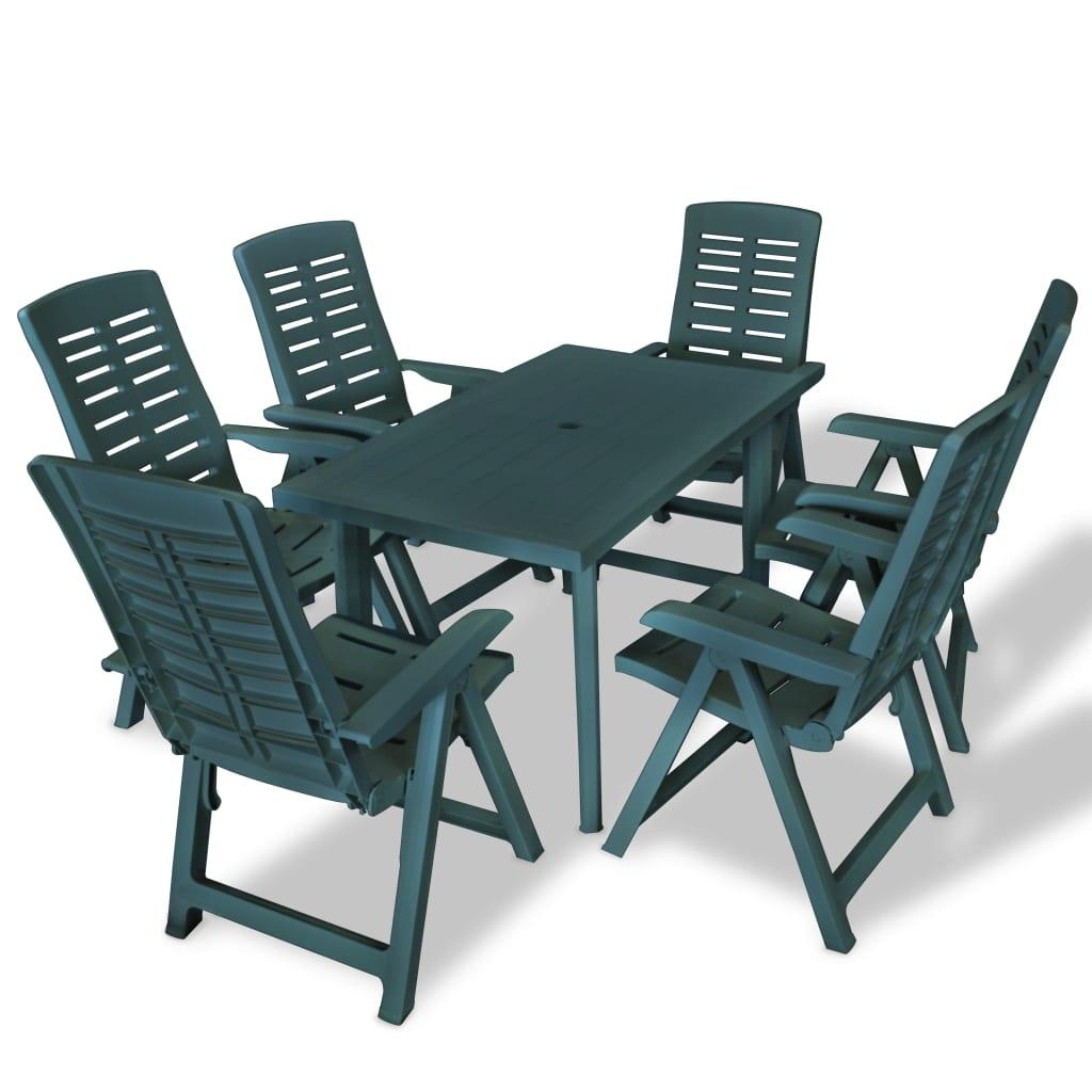 Tämä säänkestävä ulkotilan ruokailuryhmä on upea valinta ulkona puutarhassa, terassilla tai leirintäalueella ruokailuun. Puutarhapöydässä on reikä aurinkovarjolle, jotta voit käyttää sitä yhdessä varjon kanssa pysyen varjossa. Tuolien selkänojissa on 4 kallistusasetusta, joten voit siis aina löytää mukavimman mahdollisen asennon. Tuolit voidaan taittaa kokoon, jotta säästät tilaa, kun niitä ei käytetä. Sarja on valmistettu kestävästä muovista, mikä tekee pöydästä ja tuoleista säänkestävät ja helpot puhdistaa. Ulkoruokailuryhmä on myös kevyt, joten sitä on helppo siirrellä. Toimitus sisältää 1 pöydän ja 6 kokoontaitettavaa tuolia. Väri: vihreä Materiaali: muovi Säänkestävä Pöytä: Mitat: 126 x 76 x 72 cm (P x L x K) Pöydän keskellä halkaisijaltaan 3,6 cm reikä aurinkovarjolle. Helppo koota Tuoli: Mitat: 60 x 61 x 108 cm (P x L x K) Istuimen leveys: 45 cm Istuimen syvyys: 49,5 cm Istuimen korkeus maasta: 44 cm Käsinojan korkeus: 63 cm 4 kallistusasentoa Taittuu kokoon kuljetuksen helpottamiseksi Toimitus sisältää 1 x pöytä ja 6 x kokoonataittuva tuoli