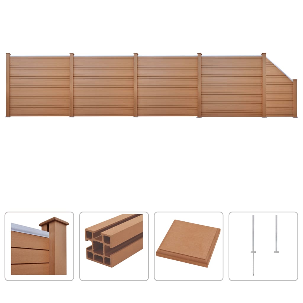Puumuovikomposiitista valmistetuilla aitapaneeleilla voit aidata pihan tai talon luodaksesi yksityisyyttä ja turvallisuutta. Puukomposiittipaneeleissa on puunsyykuvio toisella ja tavallinen kuvio toisella puolella, jolloin voi valita, kummasta pitää enemmän. Puumuovikomposiittipaneelit eivät tarvitse mitään lisäkäsittelyä, kuten öljyämistä tai maalaamista. Ne ovat hyvin lujia sekä sään- ja ruosteenkestäviä. Aidan päällinen on alumiinia, jolloin paneelit voidaan kiinnittää toisiinsa tiukasti, mikä tekee rakennelmasta vahvan. Moduulien ansiosta paneelit on helppo asentaa. Aitaa voi myös vaivatta laajentaa. Aidanpylväissä on kolme koloa, jotta aita voidaan koota monin eri tavoin, esimerkiksi suoraan (180 astetta), suorakulmaan (90 astetta) tai T-muotoon. Monikäyttöiset teräsjalat voidaan asentaa kahdella tavalla: joko kiinnittämällä ne maahan ankkuriruuveilla tai kiinnittämällä ne betonialustaan teräspiikeillä. Sekä ankkuriruuvit että kiinnityspiikit sisältyvät toimitukseen. Aita on helppo asentaa. Toimituksessa mukana 45 puu-muovikomposiittilevyä, 6 pylvästä, 6 teräsjalkaa ja 5 alumiinipalkkia. Väri: ruskea Materiaali: puukomposiitti + alumiinipäällinen Koko: 799 x 187 cm (P x L) Neliönmuotoinen paneeli: Paneelin koko (yksi levy): 170 x 20,3 cm (P x L) Levyn paksuus: 2 cm Palkin pituus: 170 cm Pylvään mitat: 9 x 9 x 185 cm (pituus x leveys x korkeus) Viistopaneeli: Levyn koko: (24 – 90) x 20,3 cm (P x L) Levyn paksuus: 2 cm Pylvään mitat: 9 x 9 x 105 cm (pituus x leveys x korkeus) Teräsjalka: Kokonaismitat: 88 x 88 x 1150 mm (pituus x leveys x korkeus) Pituus (teräspiikki mukaanluettuna): 1150 mm Pituus (ilman teräspiikkiä): 650 mm Toimitus sisältää: 45 x aitapaneeli 6 x tolppa 6 x teräsjalka 5 x alumiinipalkki