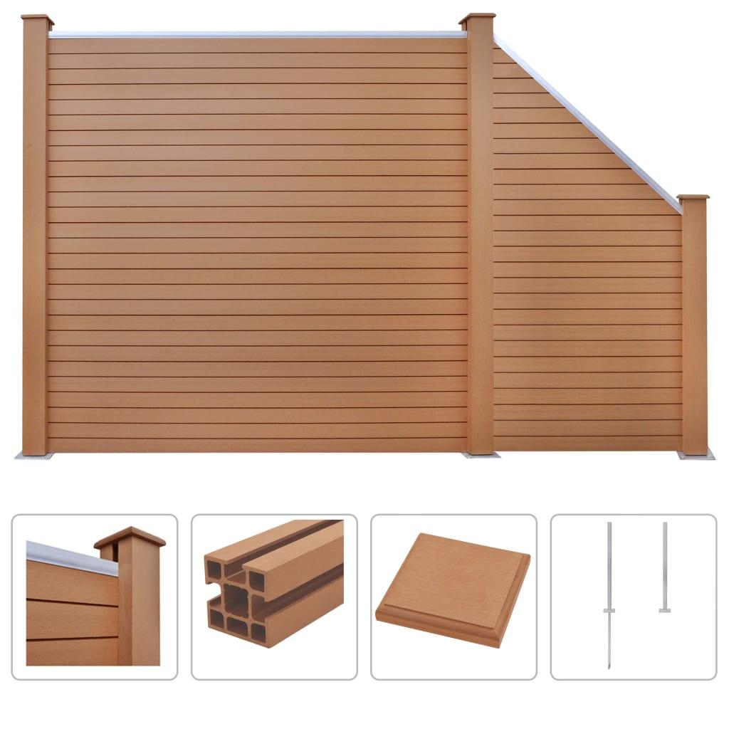 Puumuovikomposiitista valmistetuilla aitapaneeleilla voit aidata pihan tai talon luodaksesi yksityisyyttä ja turvallisuutta. Puukomposiittipaneeleissa on puunsyykuvio toisella ja tavallinen kuvio toisella puolella, jolloin voi valita, kummasta pitää enemmän. Puumuovikomposiittipaneelit eivät tarvitse mitään lisäkäsittelyä, kuten öljyämistä tai maalaamista. Ne ovat hyvin lujia sekä sään- ja ruosteenkestäviä. Aidan päällinen on alumiinia, jolloin paneelit voidaan kiinnittää toisiinsa tiukasti, mikä tekee rakennelmasta vahvan. Moduulien ansiosta paneelit on helppo asentaa. Aitaa voi myös vaivatta laajentaa. Aidanpylväissä on kolme koloa, jotta aita voidaan koota monin eri tavoin, esimerkiksi suoraan (180 astetta), suorakulmaan (90 astetta) tai T-muotoon. Monikäyttöiset teräsjalat voidaan asentaa kahdella tavalla: joko kiinnittämällä ne maahan ankkuriruuveilla tai kiinnittämällä ne betonialustaan teräspiikeillä. Sekä ankkuriruuvit että kiinnityspiikit sisältyvät toimitukseen. Aita on helppo asentaa. Toimituksessa mukana 18 puu-muovikomposiittilevyä, 3 pylvästä, 3 teräsjalkaa ja 2 alumiinipalkkia. Väri: ruskea Materiaali: puukomposiitti + alumiinipäällinen Koko: 277 x 187 cm (P x L) Neliönmuotoinen paneeli: Paneelin koko (yksi levy): 170 x 20,3 cm (P x L) Levyn paksuus: 2 cm Palkin pituus: 170 cm Pylvään mitat: 9 x 9 x 185 cm (pituus x leveys x korkeus) Viistopaneeli: Levyn koko: (24 – 90) x 20,3 cm (P x L) Levyn paksuus: 2 cm Pylvään mitat: 9 x 9 x 105 cm (pituus x leveys x korkeus) Teräsjalka: Kokonaismitat: 88 x 88 x 1150 mm (pituus x leveys x korkeus) Pituus (teräspiikki mukaanluettuna): 1150 mm Pituus (ilman teräspiikkiä): 650 mm Toimitus sisältää: 18 x aitalevy 3 x tolppa 3 x teräsjalkaa 2 x alumiinipalkki