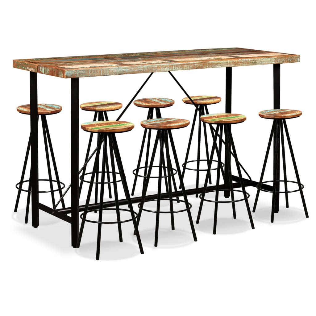 Baariryhmän tyyli on teollinen ja se on ainutlaatuinen lisä mihin tahansa kotiin, baariin tai ravintolaan. Baaripöytä ja -jakkarat on valmistettu täydestä kierrätetystä puusta, mikä tarkoittaa, että niissä on yhdistetty eri puiden, kuten tiikin, mangopuun, akaasian jne. ominaisuuksia. Kierrätetty puu on tukeva, vakaa, kestävä ja kaunis materiaali. Kulumisen jäljet antavat jokaiselle kappaleelle ainutlaatuisen ulkonäön ja teräsjalat korostavat niiden upeaa teollista tyyliä. Jokainen työvaihe on toteutettu erityisen huolellisesti, oli se sitten uudelleen kasaus, kiillotus, maalaus tai lakkaus. Toimituksessa mukana 1 baaripöytä ja 8 baarijakkaraa. Kokoaminen on helppoa. Tärkeä huomio: puun värit ja pintakuviot saattavat vaihdella kappaleesta toiseen, mikä tekee jokaisesta kappaleesta ainutlaatuisen ja hieman erilaisen muista; toimitus on satunnainen. Materiaali: kierrätetty puu ja teräs Hiottu, maalattu ja lakattu Baaripöydän mitat: 180 x 70 x 107 cm (P x L x K) Baarijakkaran mitat: 30 x 75 cm (halkaisija x K) Toimitus sisältää 1:n baaripöydän ja 8 baarijakkaraa. Helppo koota