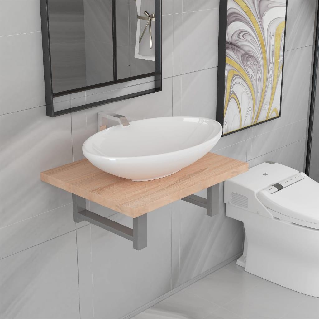Käytännöllinen ja ajaton kylpyhuoneen kaksiosainen kalustesarja koostuu seinähyllystä ja soikeasta pesualtaasta. Se on tyylikäs lisä mihin tahansa kylpyhuoneeseen, pesuhuoneeseen tai meikkihuoneeseen. Kylpyhuoneen seinähylly on valmistettu vahvasta materiaalista, joten se on erittäin vakaa ja kestävä. Se on täydellinen paikka mukana tulevan keraamisen altaan sijoittamiseen. Keraamisessa altaassa on kiiltävä pinta, ja se on helppo puhdistaa kostealla liinalla. Lisäksi kylpyhuoneen kalusteet voidaan helposti asentaa seinälle mukana tulevien kiinnikkeiden ja asennusmateriaalien avulla. Täydellisestä seinähyllyn ja pesualtaan yhdistelmästä tulee kylpyhuoneesi keskipiste! Ota huomioon, että viemäri ei sisälly toimitukseen. Seinähylly: Väri: tammi Materiaali: lastulevy + metallikehys Kokonaismitat: 40 x 40 x 16,3 cm (L x S x K) Hyllyn paksuus: 25 mm Kiinnikkeen mitat: 35 x 13,8 cm (S x K) Sisältää asennusmateriaalit Soikea pesuallas: Väri: valkoinen Materiaali: keramiikka Kokonaismitat: 40 x 33 x 13,5 cm (L x S x K) Viemäriaukon halkaisija: 4,5 cm Asennus: tason päälle Toimituksessa mukana 1 seinähylly ja 1 pesuallas