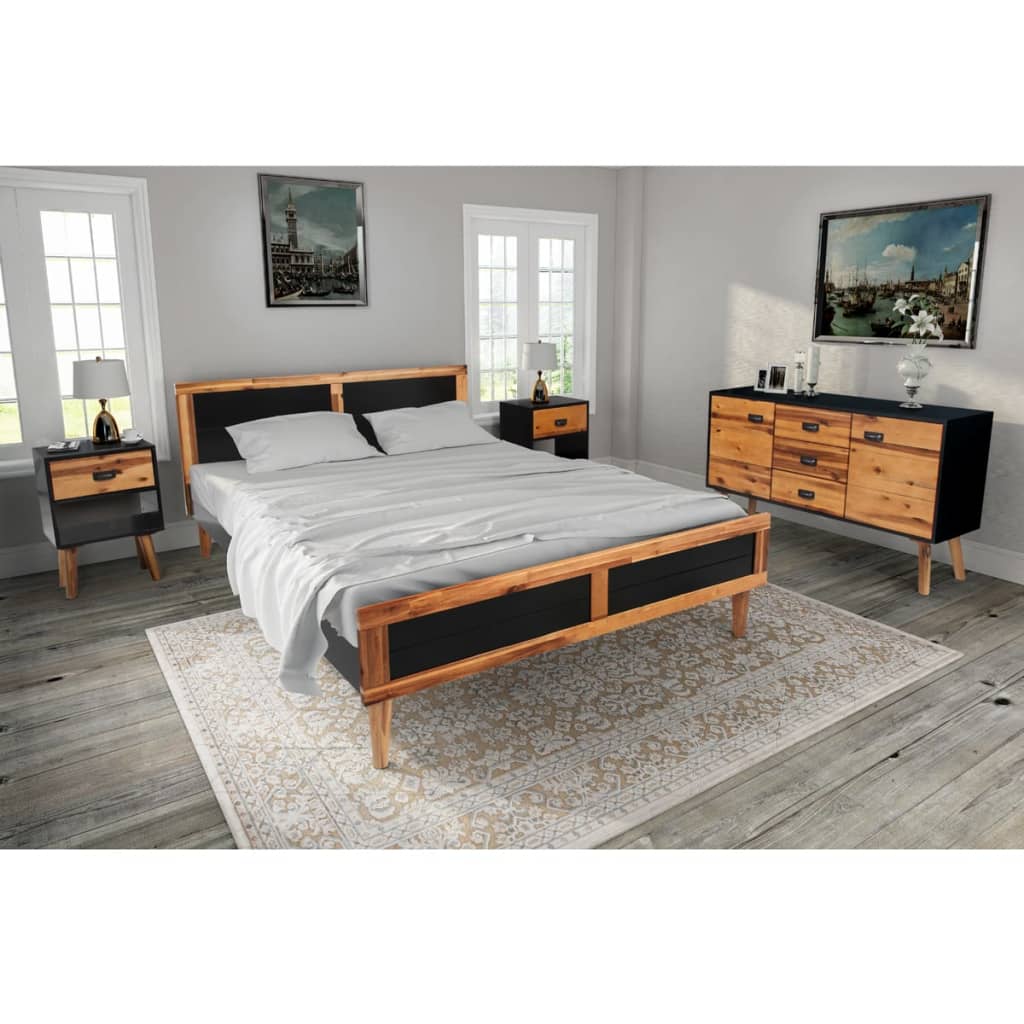Tämä täysi makuuhuoneen kalustesarja, joka koostuu 1 sängynrungosta, 2 yöpöydästä ja 1 senkistä, on ajaton lisä makuuhuoneeseesi. Kaikki osat on valmistettu täydestä akaasiapuusta ja ne huokuvat retrotunnelmaa omalaatuisen retrotyylinsä ansiosta. Tämä puinen kalustesarja on todella vakaa ja kestävä, se on ammattimaisesti valmistettu kiinteästä puusta. Sängynrunkoon sopii 200 x 140 cm kokoinen patja. Kompakteissa yöpöydissä on sujuvasti kulkevat vetolaatikot, jotka tarjoavat riittävästi tilaa järjestää pikkutavarat käden ulottuville. Laatikoiden alla olevat hyllyt tarjoavat ylimääräistä säilytystilaa. Senkissä on kolme laatikkoa ja kaksi ovellista kaappia, jonne sopii erinomaisesti kirjat, multimedialaitteet sekä muut tavarat. Tukevalle pöytätasolle voidaan asettaa esille koristeita, valokuvia tai ruukkukasveja. Todella helppo koota. Väri: musta ja ruskea Materiaali: kiinteä akaasiapuu + MDF Sängynrungon mitat: 205 x 147 x 80 cm (P x L x K) Sopivan patjan koko: 200 x 140 cm (patja ei mukana) Yöpöydän mitat: 40 x 30 x 57 cm (L x S x K) Senkin mitat: 115 x 35 x 70 cm (P x L x K) Helppo koota Toimitus sisältää: 1 x sängynrunko, 2 x yöpöytä, 1 x senkki VAROITUS: kaatumisen estämiseksi on senkkiä käytettävä mukana toimitetun seinäkiinnityslaitteen kanssa. Legal Documents: Lisätietoja huonekalujesi kaatumisen estämisestä voit löytää täältä