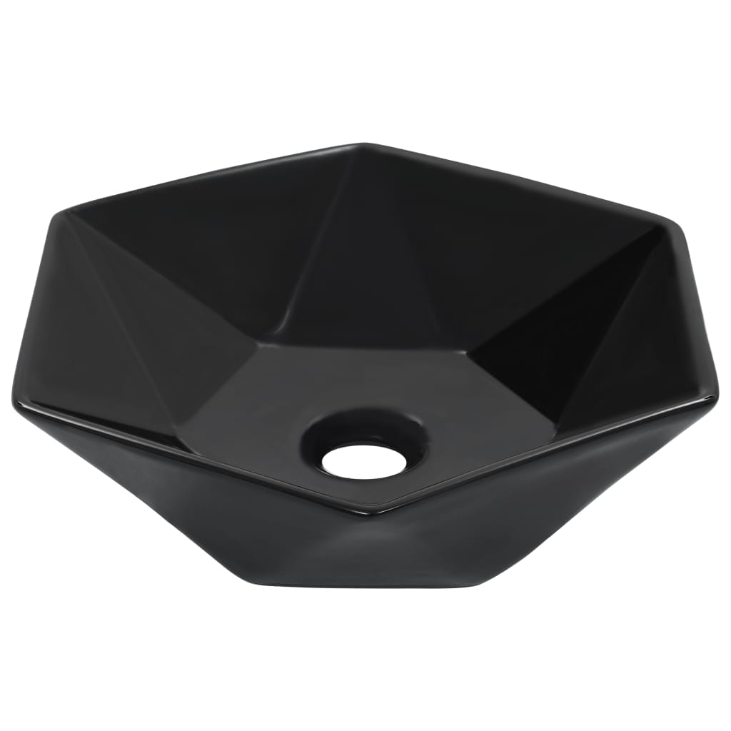 Keramiikasta valmistettu kuusikulmainen pesuallas on tyylikäs ja ajaton lisä mihin tahansa kylpyhuoneeseen, pesuhuoneeseen, pukuhuoneeseen tai meikkihuoneeseen. Pesuallas ei toimi vain päivittäisenä käyttötavarana, se on myös koriste elintilaasi. Sen trendejä asettavan ja modernin suunnittelun ansiosta pesuallas sopii mihin tahansa sisustukseen. Koska se on valmistettu keramiikasta, pesuallas on helppo puhdistaa. Pesualtaan kiiltävä pinta lisää sen charmia. Ole hyvä ja ota huomioon, että hana ja viemäri eivät sisälly toimitukseen. Väri: musta Materiaali: keramiikka Kokonaismitat: 41 x 36,5 x 12 cm (P x L x K) Viemäriaukon halkaisija: 4,5 cm Asennus: tason päälle