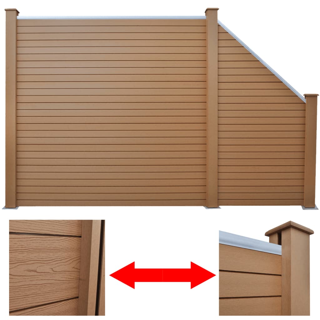 Puukomposiitista valmistetut aitapaneelimme, jotka sisältävät enimmäkseen puukuituja ja muovia, ovat taloudellisia sekä ympäristöystävällisiä. Niitä voidaan käyttää puutarhan tai talon aitana luomaan turvallisuutta ja yksityisyyttä. Puukomposiittiaidassa on puun pintakuviointi toisella ja tavallinen kuvio toisella puolella, voit valita kummasta pidät enemmän. Puukomposiitista valmistettu aitapaneelimme ei vaadi lisäkäsittelyä kuten öljyämistä tai maalausta. Se on todella kestävä ja siihen ei vaikuta UV-säteet, korkea kosteus tai lämpötilan vaihtelut. Alumiinisen yläprofiilin ansiosta, aitapaneelit ovat tiukasti kiinnitetty toisiinsa, mikä lisää niiden vakautta ja iskunkestävyyttä. Sen moduulirakenteen ansiosta, aitapaneeli on helppo asentaa ja sallii aidan vapaan laajentamisen. Tolpissa on kolme uraa, jotka mahdollistavat aidan asentamisen eri tavoilla kuten suoraan linjaan (180 astetta), oikeaan kulmaan (90 astetta) tai T-muotoon. Varoitus: Puukomposiittipaneelit taipuvat, jos ne säilytetään vaakatasossa maassa. Asenna paneelit heti kun olet vastaanottanut ne. Jos sinun täytyy säilyttää paneeleja pidemmän aikaa ennen niiden asentamista, säilytä ne pystyasennossa (pitkällä reunalla). Väri: ruskea Materiaali: puumuovikomposiitti Puukomposiitti sisältää: 60% puupulveria + 30% muovia + 10% lisäaineita Kokonaisleveys: noin 283 cm Sarja sisältää 1 neliönmuotoisen aitapaneelin ja 1 viiston aitapaneelin. Neliö aita: Mitat: 187 x 187,6 cm (L x K) Puukomposiittilevy: 170 x 20,8 x 1,85 cm (P x L x Paks.) Tolpan korkeus: 185 cm Teräsjalan korkeus: 75 cm Viisto aita: Mitat: 106 x (106,8 – 186,8) cm (L x K) Puukomposiittilevy: (24 – 90) x 20,8 x 1,85 cm (P x L x Paksuus) Tolpan korkeus: 105 cm Teräsjalan korkeus: 60 cm Toimitus sisältää: 18 x puukomposiittilevy 3 x puukomposiittitolppa 3 x puukomposiittitolpan tulppa 3 x teräsjalkaa 2 x alumiininen yläprofiili 12 x teräksinen laajennusruuvi