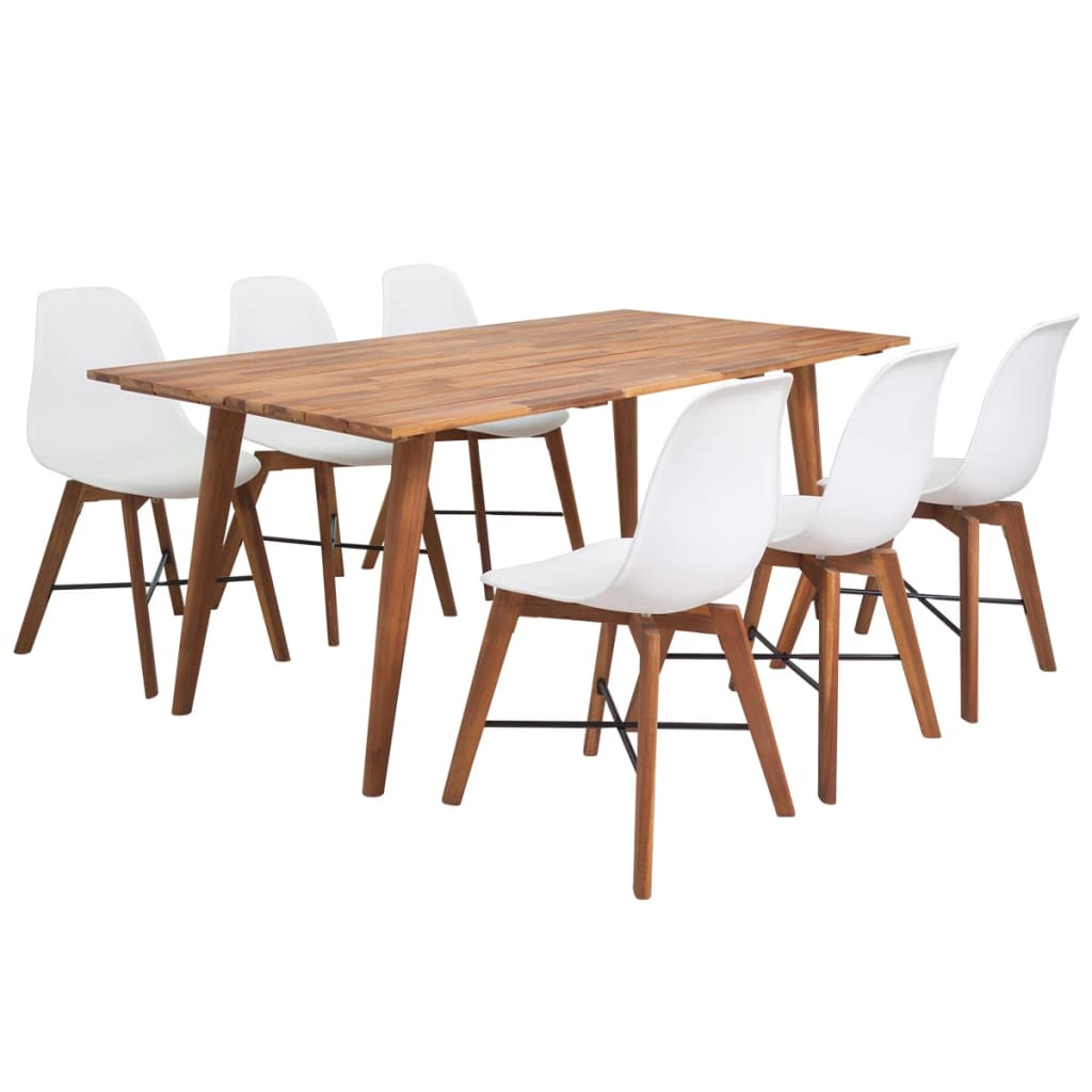 Sulavalinjainen, nykyaikainen ruokailuryhmä koostuu 1 pöydästä ja 6 ruokatuolista, se on upea valinta ruokasaliin tai keittiöön. Niiden elegantti muotoilu luo ylellistä tunnelmaa mihin tahansa illallishetkeen. Tukeva ja kestävä ruokapöytä on valmistettu täydestä kovapuusta. Ergonomiseksi suunniteltujen, kaarevasti muotoiltujen tuolien istuimet on valmistettu korkealaatuisesta muovista ja jalat kiinteästä puusta, joten tuolit ovat mukavat istua sekä erittäin tukevat. Tämä ruokailuryhmä on todella helppo puhdistaa kostealla liinalla. Ne on todella helppo koota. Toimitus sisältää 1 suorakulmaisen pöydän ja 6 ruokatuolia. Pöytä: Väri: ruskea Materiaali: akaasiapuu Mitat: 180 x 90 x 75 cm (P x L x K) Tuoli: Väri: valkoinen Materiaali: muovi, täysi akaasiapuu Mitat: 54 x 48 x 86.5 cm (L x S x K) Istuimen leveys: 47 cm Istuimen korkeus maasta: 46 cm Helppo koota Toimitus sisältää 1 pöydän ja 6 ruokatuolia