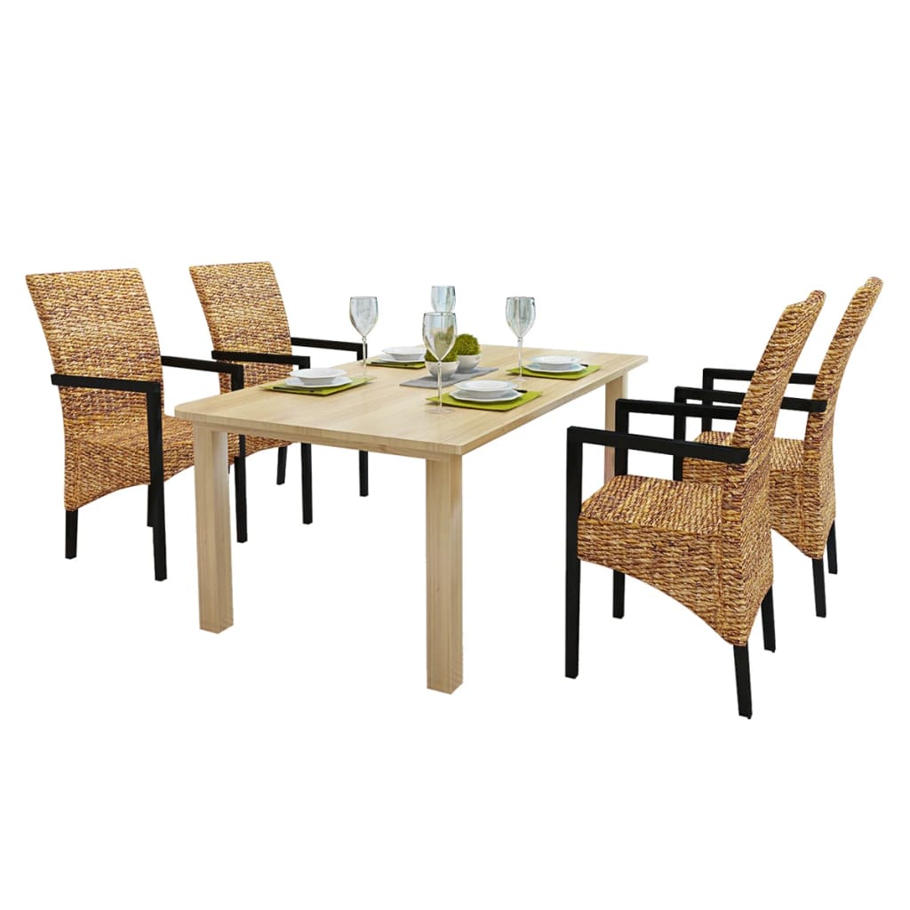 Tämä on laadukas 4:n laadukkaan käsin punotun manilahamppu tuolin sarja. Niiden Manila tyylin ansiosta, nämä manilahamppu punotut ruokatuolit ovat eksoottinen lisä sisustukseesi. Kovapuurunko ja luonnolliset abaca lehdet (banaani lehdet) tekevät tuoleista tukevarakenteiset, sekä esteettiset. Abaca päällysteiset istuimet ovat myös todella mukavat istua. Jos etsit jotain täydentämään keittiön ja ruokasalin sisustusta, nämä hienot punotut tuolit ovat upea valinta. Toimitus sisältää 4 tuolia. Huomioi : Tuolit ovat käsin punottu luonnollisesta abacasta, joten väri saattaa hieman vaihdella. Materiaali: Täysi mangopuu + laadukkaat abaca lehdet Koko: 54 x 58 x 105 cm (L x S x K) Istuimen leveys: 46 cm Istuimen syvyys: 44 cm Istuimen korkeus maasta: 47 cm Käsinojan korkeus maasta: 71 cm Toimitus sisältää 4 tuolia.