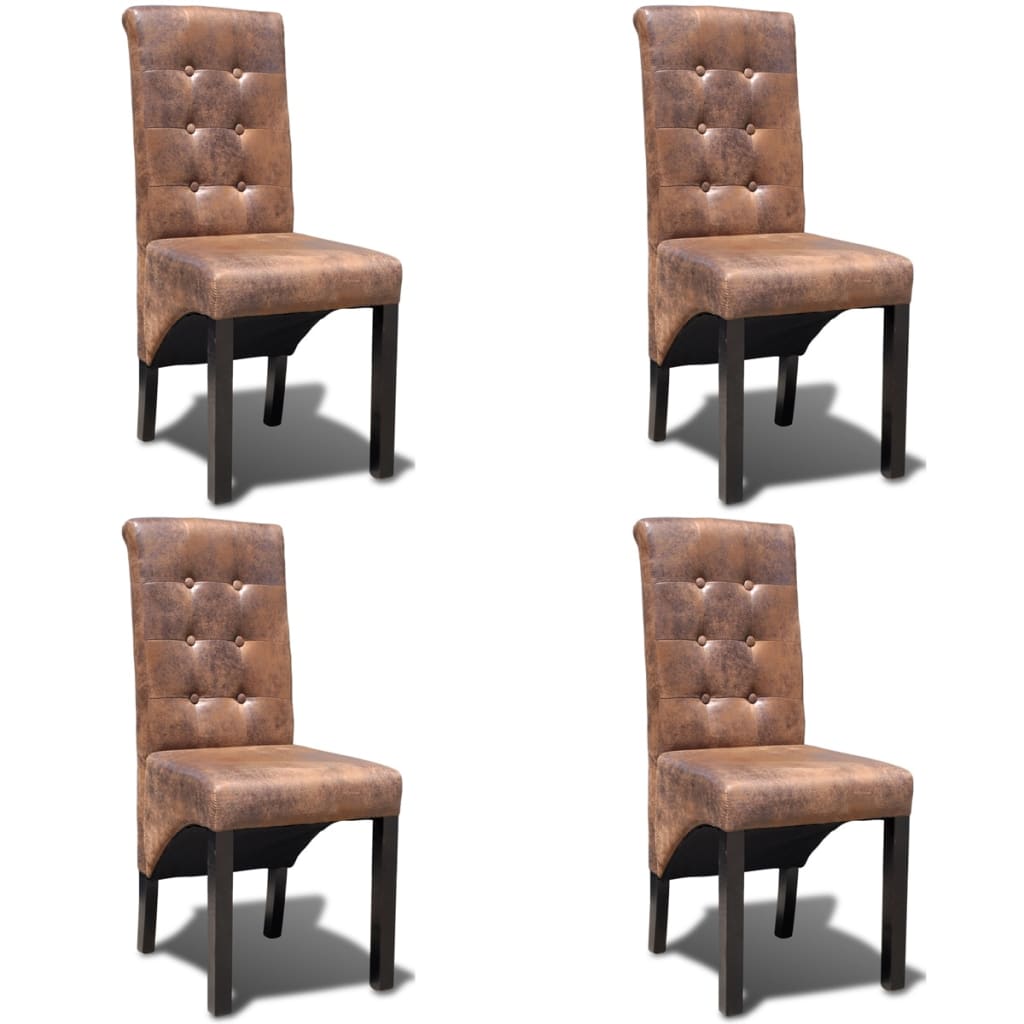 Tämä sarja koostuu neljästä elegantin ajattomasta ruokatuolista, joka on mahtava lisä keittiöösi tai ruokasaliisi. Näissä mukavissa ruokatuoleissa on korkealaatuinen puurakenne. Ruokatuolit on päällystetty 100% polyesteri keinonahalla, joten ne näyttävät mokkanahkaisilta. Istuin ja selkänoja on pehmustettu paksusti tarjoten parhaan istumamukavuuden. Selkänojan kuusi nappia ovat kiva pieni yksityiskohta. Toimitus sisältää 4 x ruokatuoli Väri: ruskea mokkanahkainen ulkonäkö Materiaali: puu + keinonahka Kokonaismitat: 53 x 43 x 96 cm (L x S x K) Istuimen korkeus maasta: 47 cm Selkänojan korkeus: 51,5 cm Toimitus sisältää 4 x ruokatuoli Tekstiili: Polyesteri: 100%
