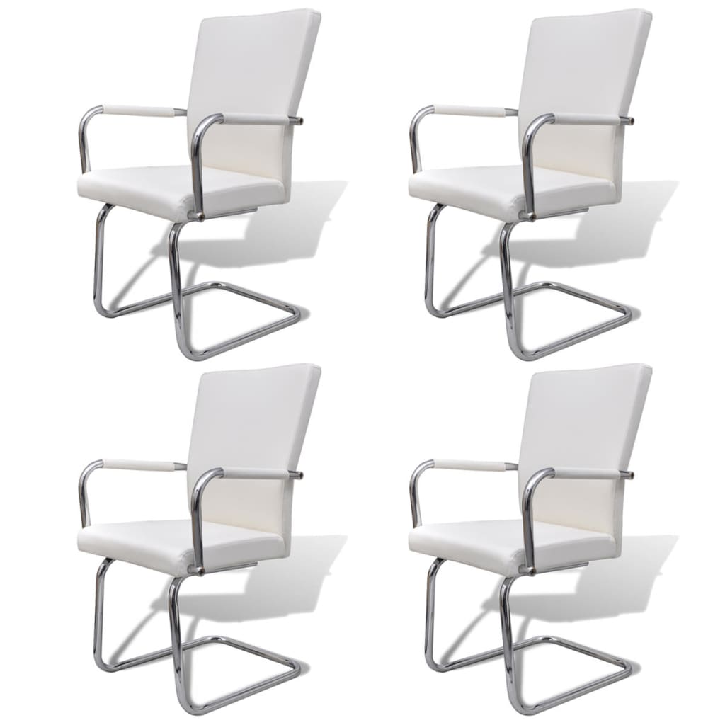Tämä sulavalinjainen, modernisti muotoiltu ruokailutuolisarja soveltuu mihin tahansa keittiöön tai ruokailuhuoneeseen. Niiden paksusti pehmustetun istuimen ja selkänojan ansiosta, nämä keinonahkaiset tuolit ovat erittäin mukavat istua. Tuolien jalat on valmistettu kestävästä kromatusta raudasta, joka voidaan puhdistaa helposti. Nämä kauniit tuolit ovat nykyaikaiset, mutta ajattomat. Helppo koota. Toimitus sisältää 4 keinonahka tuolia. Väri: valkoinen Materiaali: keinonahka + kromattu rauta Mitat: 52 x 54 x 92 cm (L x S x K) Istuimen leveys: 46 cm Istuimen syvyys: 41 cm Istuimen korkeus maasta: 45 cm Helppo koota Toimitus sisältää 4 korkealaatuista tuolia