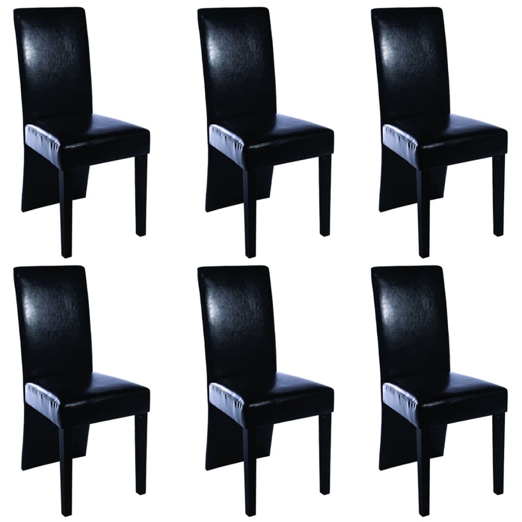Tämä sulavalinjainen, modernisti muotoiltu ruokailutuolisarja soveltuu mihin tahansa keittiöön tai ruokailuhuoneeseen. Paksusti täytettyjen istuinosien ja selkänojien ansiosta, näissä keinonahkaisissa tuoleissa on erittäin mukava istua. Jalat ovat tehty kestävästä puusta, joka on helppo pitää puhtaana. Nämä hurmaavat tuolit ovat moderneja, mutta ajattomia. Kokoaminen on erittäin helppoa. Toimitus sisältää 6 keinonahkaista tuolia. Materiaali: keinonahka + puu Koko: 43 x 53 x 93 cm (L x S x K) Väri: musta Helppo koota Toimitus sisältää 6 x korkealaatuinen tuoli Tekstiili: Puuvilla: 20%, Polyesteri: 35%, Polyuretaani: 10%, Polyvinyylikloridi: 35%