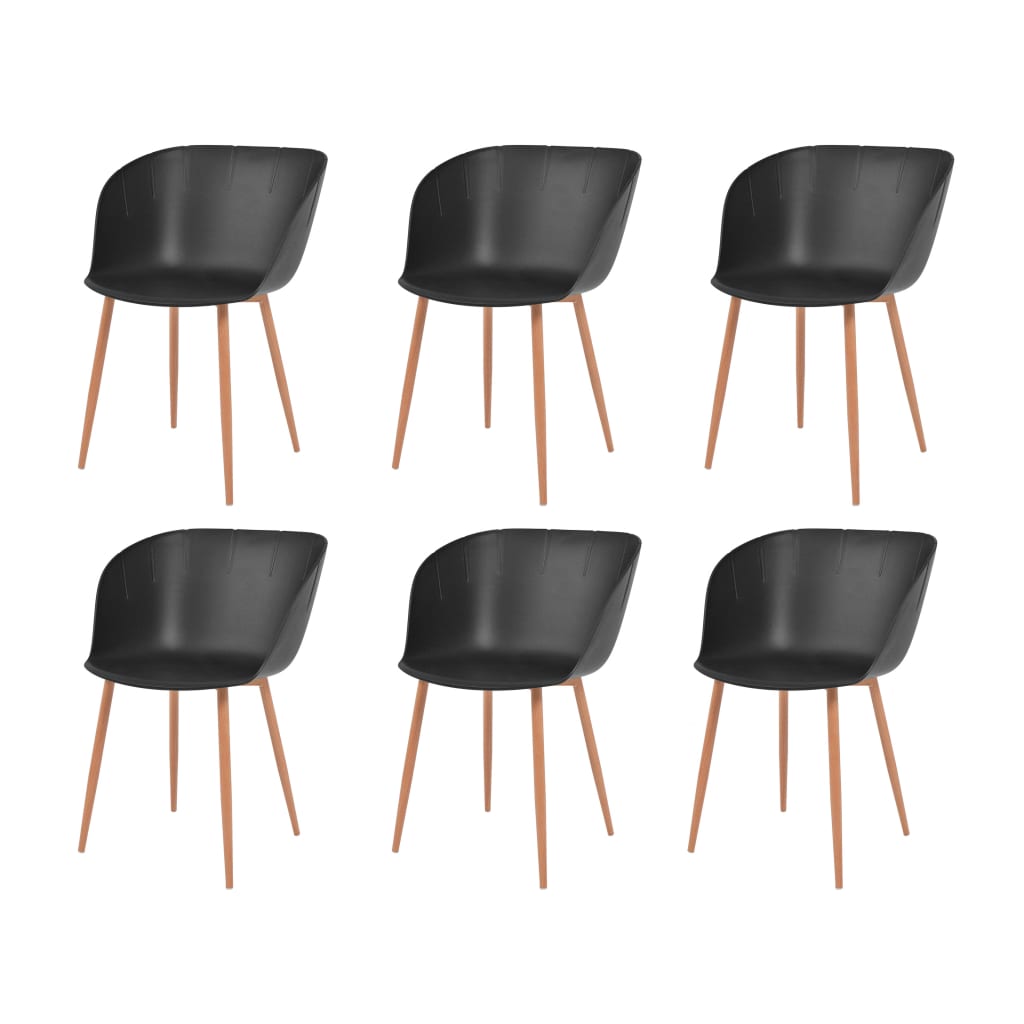 Tämä moderni ruokapöydän tuolisarja ei ole vain kaunis, mutta myös todella mukava ja se lisää hieman mukavuutta sekä tyyliä sisustukseesi. Tuolit sopivat täydellisesti ruokasalissa ruokailuun, tai olohuoneessa rentoutumiseen ja lukemiseen. Tuolit ovat ergonomisesti suunnitellut, minkä ansiosta niissä on mukava istua jopa tuntien ajan. Tuolit on valmistettu korkealaatuisista materiaaleista, joten ne ovat kestäviä ja vakaita. Toimitus sisältää 6 ruokatuolia. Väri: musta Materiaali: muovinen istuin + teräsjalat (pyökkipuinen ulkonäkö) Mitat: 50,5 x 55 x 79 cm (L x S x K) Istuimen leveys: 44 cm Istuimen syvyys: 40 cm Istuimen korkeus maasta: 46 cm Toimitus sisältää 6 tuolia Helppo koota