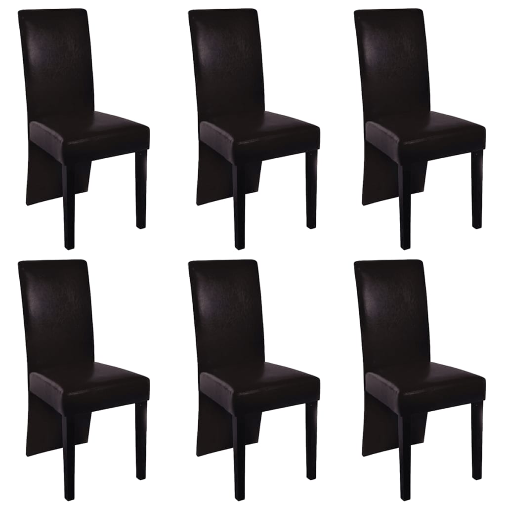 Tämä sulavalinjainen, modernisti muotoiltu ruokailutuolisarja soveltuu mihin tahansa keittiöön tai ruokailuhuoneeseen. Paksusti täytettyjen istuinosien ja selkänojien ansiosta, näissä keinonahkaisissa tuoleissa on erittäin mukava istua. Jalat ovat tehty kestävästä puusta, joka on helppo pitää puhtaana. Nämä hurmaavat tuolit ovat moderneja, mutta ajattomia. Kokoaminen on erittäin helppoa. Toimitus sisältää 6 keinonahkaista tuolia. Materiaali: keinonahka + puu Mitat: 43 x 53 x 93 cm (L x S x K) Väri: ruskea Helppo koota Toimitus sisältää 6 x korkealaatuinen tuoli Tekstiili: Puuvilla: 20%, Polyesteri: 35%, Polyuretaani: 10%, Polyvinyylikloridi: 35%