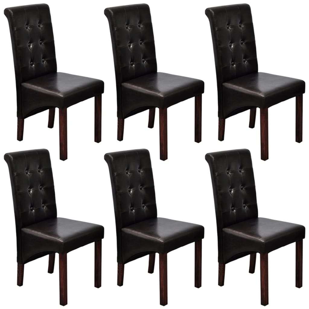 Tämä sulavalinjainen, modernisti muotoiltu ruokailutuolisarja soveltuu mihin tahansa keittiöön tai ruokailuhuoneeseen. Paksusti täytettyjen istuinosien ja selkänojien ansiosta, näissä keinonahkaisissa tuoleissa on erittäin mukava istua. Jalat ovat tehty kestävästä puusta, joka on helppo pitää puhtaana. Nämä hurmaavat tuolit ovat moderneja, mutta ajattomia. Kokoaminen on erittäin helppoa. Toimitus sisältää 6 keinonahkaista tuolia. Materiaali: keinonahka + puu Mitat: 43 x 40 x 95 cm (L x S x K) Väri: tummanruskea Helppo koota Toimitus sisältää 6 x korkealaatuinen tuoli Tekstiili: Puuvilla: 20%, Polyesteri: 35%, Polyuretaani: 10%, Polyvinyylikloridi: 35%