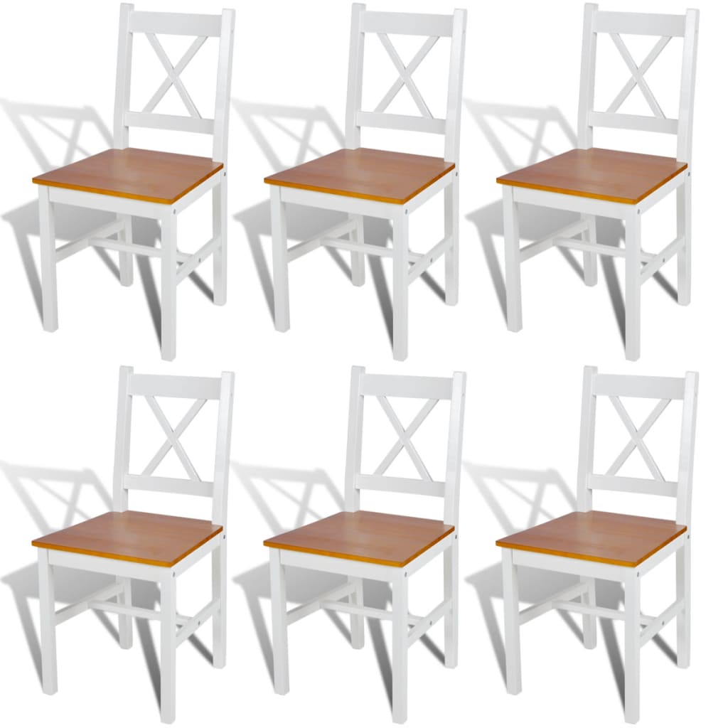 Tämä ruokatuolisarja, joka on yksinkertaisen elegantti, sisältää 6-osaa ja on loistava lisä ruokasaliin tai keittiöön. Tuolit on valmistettu täydestä männystä, joka tekee niistä vakaat ja kestävät. Ruokatuolit ovat helpot puhdistaa niin sileän maalipinnan ansiosta. Ne ovat ergonomisesti suunnitellut mukavuuden takaamiseksi. Toimitus sisältää 6 ruokatuolia. Väri: valkoinen ja luonnollinen Materiaali: mänty Tuolin koko: 41,5 x 45,5 x 85,5 cm (L x S x K) Istuimen koko: 41,5 x 41 cm (L x S) Istuimen korkeus maasta: 44,5 cm Selkänojan korkeus: 41 cm Etujalan koko: 3 x 3 cm (P x L) Takajalan koko: 4,5 x 3 cm (P x L) Toimitus sisältää 6 ruokatuolia