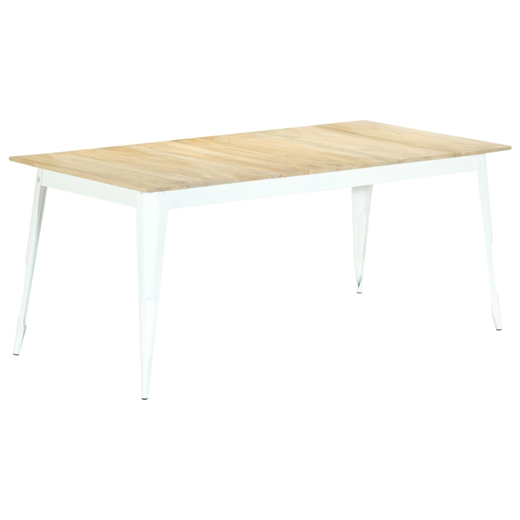 Upea teollistyylinen puuruokapöytä on omalaatuinen lisä keittiösi tai ruokailutilasi sisustukseen. Tämä ruokapöytä on valmistettu täydestä mangopuusta, joka on tiheä ja vankka lehtipuu kauniilla luonnollisilla pintajuovilla ja -kuvioilla. Erinomainen käsityön jälki korostaa pöydän upeaa retrotyyliä. Jauhemaalatut teräsjalat täydentävät sen teollisen ulkonäön. Jokainen työvaihe on tehty erityisen huolella, oli se sitten kiillotus tai lakkaus. Ruokapöydän kokoaminen on helppoa. Tärkeä huomio: voit nähdä mangopuun luonnolliset pintakuviot, minkä ansiosta jokainen ruokapöytä on ainutlaatuinen sekä hieman erilainen kuin muut; toimitus on satunnainen. Väri: Puun värinen pöytälevy + valkoiset jalat Materiaali: täysi mangopuu ja jauhemaalattu teräs Mitat: 180 x 90 x 76 cm (P x L x K) Viimeistely: hiottu, maalattu ja lakattu