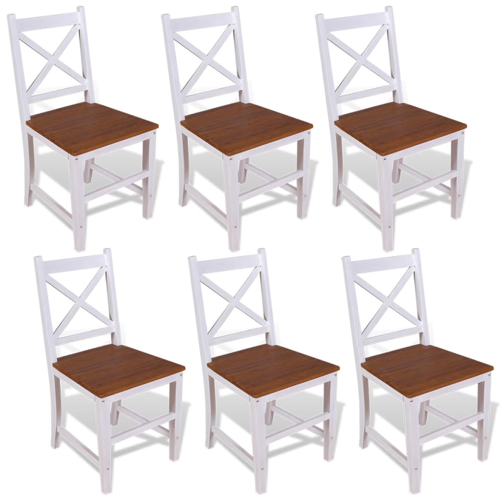 Näissä tiikistä ja mahongista valmistetuissa ruokatuoleissa on tyylikäs ja käytännöllinen muotoilu, ja ne ovat täydellinen lisä keittiöön tai ruokailutilaan. Istuimet on valmistettu täydestä tiikistä öljytyllä ja rustiikkisella viimeistelyllä, mikä tekee niistä kestävät ja kosteutta hylkivät. Tukeva runko, jalat ja tuolien selkänojat on valmistettu täydestä mahongista maalatulla pinnalla. Toimituksessa on 6 ruokapöydän tuolia. Helppo koota. Väri: ruskea ja valkoinen Istuimen materiaali: 100 % kiinteä ja öljytty tiikki, rustiikkinen viimeistely Rungon, jalkojen ja selkänojien materiaali: 100% mahonki valkoiseksi maalatulla pinnalla Mitat: 45 x 50 x 90 cm (L x S x K) Istuimen koko: 45 x 43 cm (L x S) Istuimen korkeus maasta: 46 cm Sopii sisäkäyttöön Helppo koota Toimitus sisältää 6 ruokatuolia