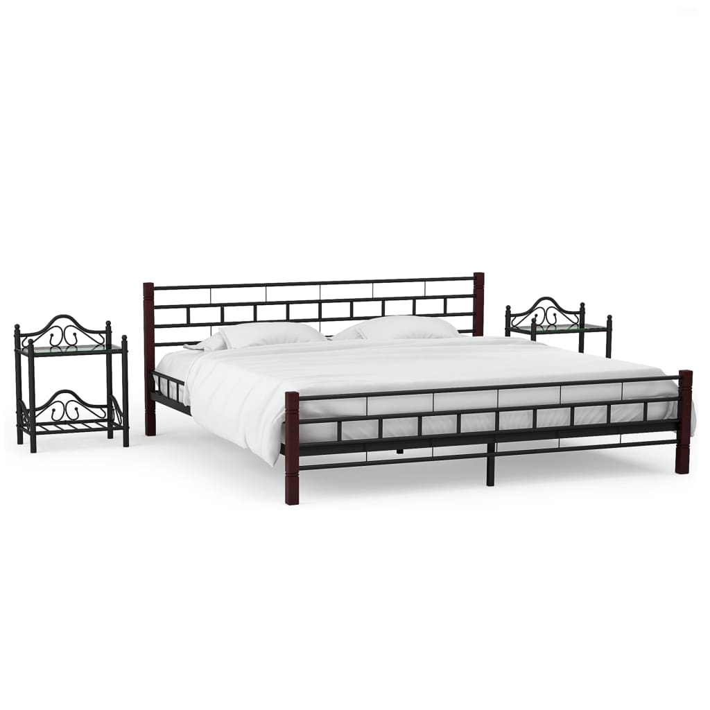 Tämän neliömäisesti muotoillun sängynrungon ja kahden yhteensopivan yöpöydän sarja tulee olemaan omalaatuinen lisä makuuhuoneesi sisustukseen Sängynrunko on valmistettu vankasta teräksestä. Mukana tulee myös sälepohja. Yöpöydät on valmistettu teräksestä ja karkaistusta lasista, mikä tekee niistä vakaat, kestävät ja helppohoitoiset. Tyylikäs muotoilu korostaa sängyn modernia tyyliä. Näiden kaikkien ominaisuuksien ansiosta se takaa sinulle aina mukavat yöunet! Kummassakin yöpöydässä on lisäksi 2 hyllyä, joihin voit laittaa pieniä tavaroita. Kaarevat teräsrakenteet tekevät sängyn tyylistä elegantin. Tämä kalustesarja palvelee sinua erinomaisen hyvin hyödyllisillä ominaisuuksillaan. Toimitus sisältää 1 sängynrungon ja 2 yöpöytää. Makuuhuoneen kalustesarja on helppo koota. Huomioithan, että patja ei sisälly toimitukseen. Väri: musta Sängynrunko Neliömäinen suunnittelu Materiaali: teräsrunko + vanerisäleet + kiinteä mänty Mitat: 210 x 167 x 76 cm (P x L x K) Sopiva patjan koko: 160 x 200 cm (L x P) (patja ei sisälly tilaukseen) Sisältää sälepohjan Puutyyliset metallijalat Yöpöydät: Materiaali: teräs ja karkaistu lasi Mitat: 45 x 30,5 x 60 cm (L x S x K) Karkaistun lasin paksuus: 5 mm Kaksi hyllyä Toimitus sisältää 1 sängynrungon ja 2 yöpöytää