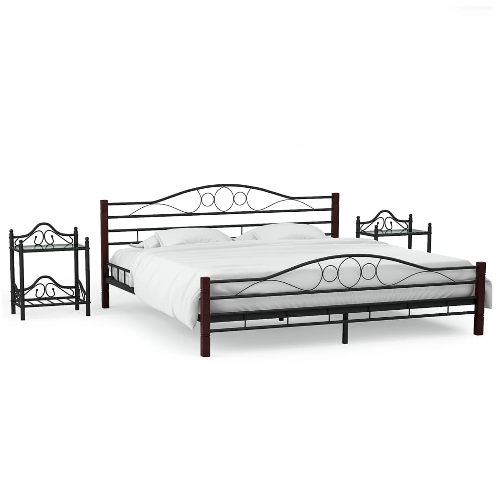 Tämän kaarevasti muotoillun sängynrungon ja kahden yhteensopivan yöpöydän sarja tulee olemaan omalaatuinen lisä makuuhuoneesi sisustukseen Sängynrunko on valmistettu vankasta teräksestä. Mukana tulee myös sälepohja. Yöpöydät on valmistettu teräksestä ja karkaistusta lasista, mikä tekee niistä vakaat, kestävät ja helppohoitoiset. Tyylikäs muotoilu korostaa sängyn modernia tyyliä. Näiden kaikkien ominaisuuksien ansiosta se takaa sinulle aina mukavat yöunet! Kummassakin yöpöydässä on lisäksi 2 hyllyä, joihin voit laittaa pieniä tavaroita. Kaarevat teräsrakenteet tekevät sängyn tyylistä elegantin. Tämä kalustesarja palvelee sinua erinomaisen hyvin hyödyllisillä ominaisuuksillaan. Toimitus sisältää 1 sängynrungon ja 2 yöpöytää. Makuuhuoneen kalustesarja on helppo koota. Huomioithan, että patja ei sisälly toimitukseen. Väri: musta Sängynrunko Kaareva muotoilu Materiaali: teräsrunko + vanerisäleet + kiinteä mänty Mitat: 210 x 167 x 85 cm (P x L x K) Sopiva patjan koko: 160 x 200 cm (L x P) (patja ei sisälly tilaukseen) Sisältää sälepohjan Puutyyliset metallijalat Yöpöydät: Materiaali: teräs ja karkaistu lasi Mitat: 45 x 30,5 x 60 cm (L x S x K) Karkaistun lasin paksuus: 5 mm Kaksi hyllyä Toimitus sisältää 1 sängynrungon ja 2 yöpöytää
