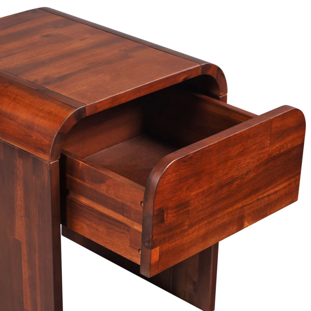 Tämä laadukas makuuhuoneen huonekalusarja, joka on valmistettu tukevasta akaasia puusta, tulee olemaan makuuhuoneesi keskipiste. Sen elegantin mutta yksinkertaisen tyylin ja muodon takia, tämä ruskea puinen sänky antaa makuuhuoneeseesi hieman sivistynyttä charmia. Päätylevy, joka on jaettu pystytangoilla, lisää sängyn runkoon modernin ilmeen. Tähän sängyn runkoon sopii 200 x 180 cm patja. Tämä yöpöytä, laatikolla ja yksinkertaisella suunnittelulla, sopii yö- tai puhelinpöydäksi. Laatikko tarjoaa riittävän tilan, jotta voit pitää pienet tavarat järjestyksessä ja kätesi ulottuvilla. Toimituksessa on laadukas sängyn runko ja kaksi tukevaa yöpöytää. Ole hyvä ja ota huomioon, että patja ja säleet eivät kuulu mukaan. Sänky : Väri: Ruskea, lakattu pinta Materiaali: Akaasia puu Koko: 215,2 x 184,5 x 86 cm (P x L x K) Sopiva patjakoko: 200 x 180 cm (patja ei mukana toimituksessa) Päätylevyn korkeus: 86 cm Jalkalevyn korkeus: 46 cm Nukkumiskorkeus: 36 cm Tukevat U-muotoiset jalat Laadukas puinen sänky, jossa keskipalkki (säleetön runko) Kaappi : Materiaali: Täysi akaasia puu Väri: Ruskea Koko: 41,5 x 42 x 50 cm (L x Syv. x K) Yksi laatikko Toimituksessa mukana : 1 x Sänky 2 x Yöpöytä Helppo koota