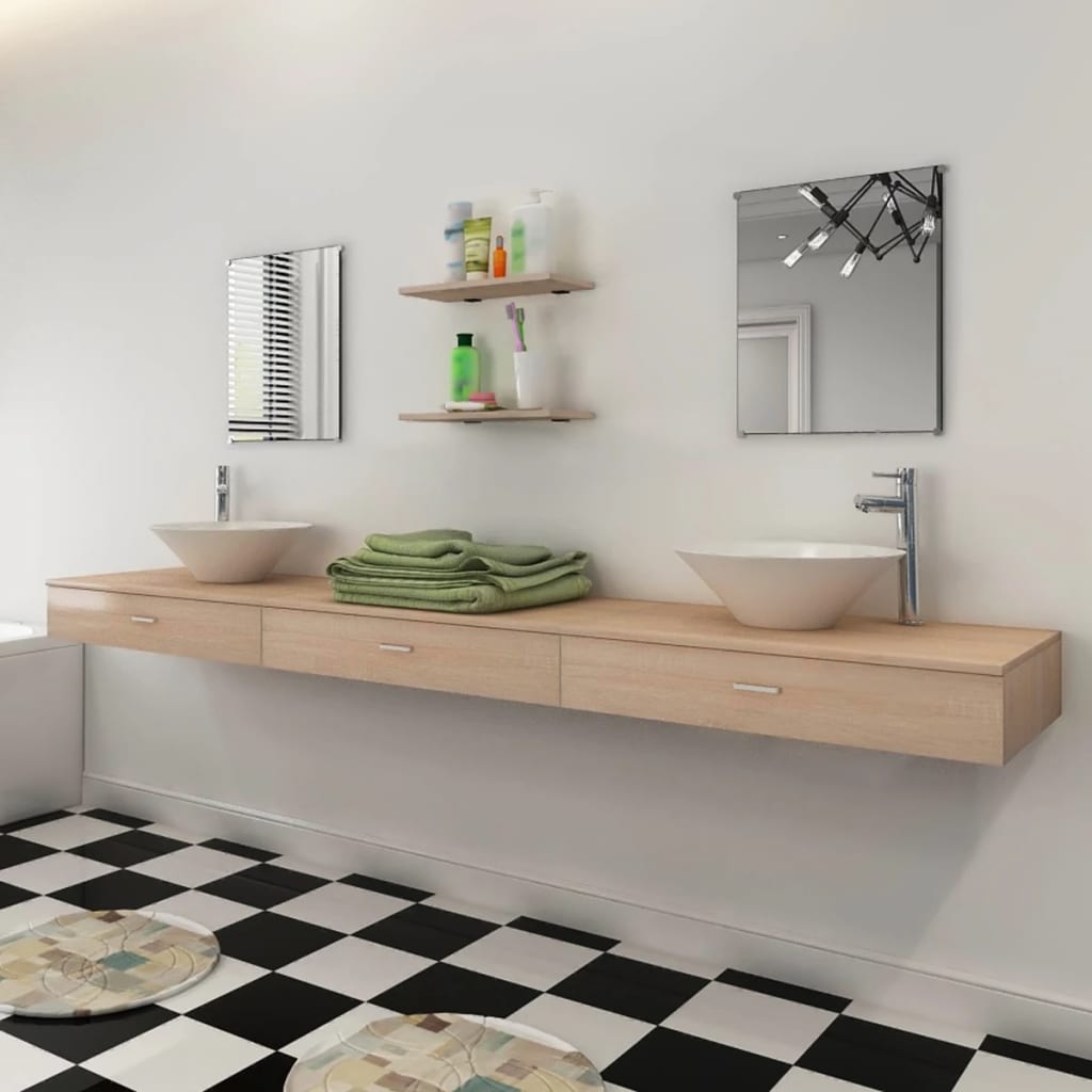 Tässä sarjassa on 1 seinäkiinnitettävä pesualtaan hylly, 2 peiliä, 2 hyllyä ja 2 pesuallasta, se on upea lisä kylpyhuoneeseen, optimoiden tilasi laadusta tinkimättä. Kylpyaltaan kaapissa on yksi suuri laatikko keskellä ja se tarjoaa riittävän tilan pesutarvikkeille, kauneudenhoitotuotteille ja erilaisille pienille tavaroille. Kaksi muuta ovat valelaatikoita, joiden taakse hanajärjestelmä on piilotettu. Kammat, kosmetiikka, hammasharjat ja hammastahnat voidaan järjestää hyllyille kätevästi käden ulottuville. Koska se on valmistettu laadukkaasta lastulevystä, tämä sarja on todella kestävä. Kaksi pesuallasta on valmistettu laadukkaasta keramiikasta, siksi se on naarmuuntumaton, ruostumaton ja helppo puhdistaa. Ne sopivat tason yläpuolelle asennettavaksi. Helppo koota. Toimituksessa on myös kaksi pop-up viemärin tulppaa ja asennustarvikkeet. Huomioithan: Hanat eivät sisälly toimitukseen; hanojen reiät eivät ole valmiiksi porattuina. Kylpyhuoneen meikkiosa : Väri: Beige Materiaali: Lastulevy Pesualtaan kaapin mitat: 225 x 48 x 15 cm (P x L x K) Peilin koko: 50 x 40 cm (P x L) Hyllyn koko: 40 x 20 cm (L x Syv.) Pesuallas : Väri: Valkoinen Materiaali: Keramiikka Koko: 420 x 140 mm (Halk. x K) Asennus: Tason päälle Toimituksessa mukana : 1 x Seinäkiinnitettävä kaappi 2 x Peili 2 x Hylly 2 x Pesuallas 2 x Pop-up viemärin tulppa Asennustarvikkeet