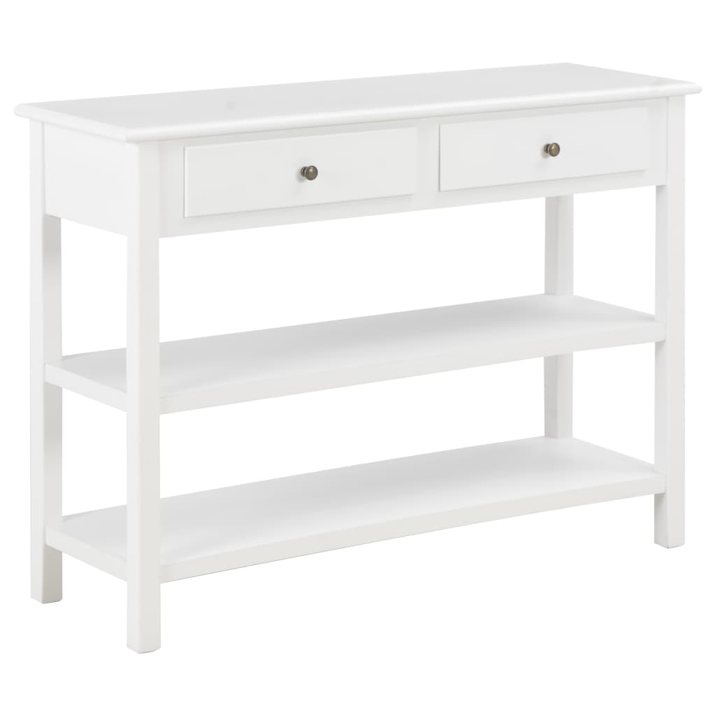 Luo siisti koti tyylikkäällä sivupöydällä! Se on todella koristeellinen lisä kotiisi. Tämä MDF:stä valmistettu senkki on erittäin tukeva ja kestävä. Sivukaapissa on 2 vetolaatikkoa ja 2 hyllyä, jotka tarjoavat runsaasti tilaa avainten, muistilehtiöiden, kynien ja muiden esineiden pitämiseen järjestyksessä ja kädenulottuvilla. Lisäksi suuri yläosa on ihanteellinen multimedialaitteiden sijoittamiseen tai koriste-esineiden esille panemiseen. Sivukaappi on helppo koota. Väri: valkoinen Materiaali: MDF Mitat: 110 x 35 x 80 cm (L x S x K) 2 laatikkoa ja 2 hyllyä