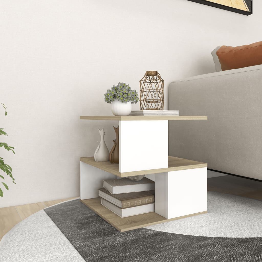 Lisää modernia tunnelmaa sisustukseesi tällä käytännöllisellä sivupöydällä. Tässä sivupöydässä on kaksi hyllyä, jotka tarjoavat runsaasti tilaa tärkeiden tavaroidesi hyvässä järjestyksessä ja käden ulottuvilla pitämiseen. Pintalevy tarjoaa vakaan alustan, jolle voi asettaa juomia, kirjoja ja koriste-esineitä. Pöytä on helppo puhdistaa kostealla liinalla. Väri: Sonoma-tammi ja valkoinen Materiaali: lastulevy Mitat: 40 x 40 x 40 cm (P x S x K) Asennus vaaditaan: kyllä