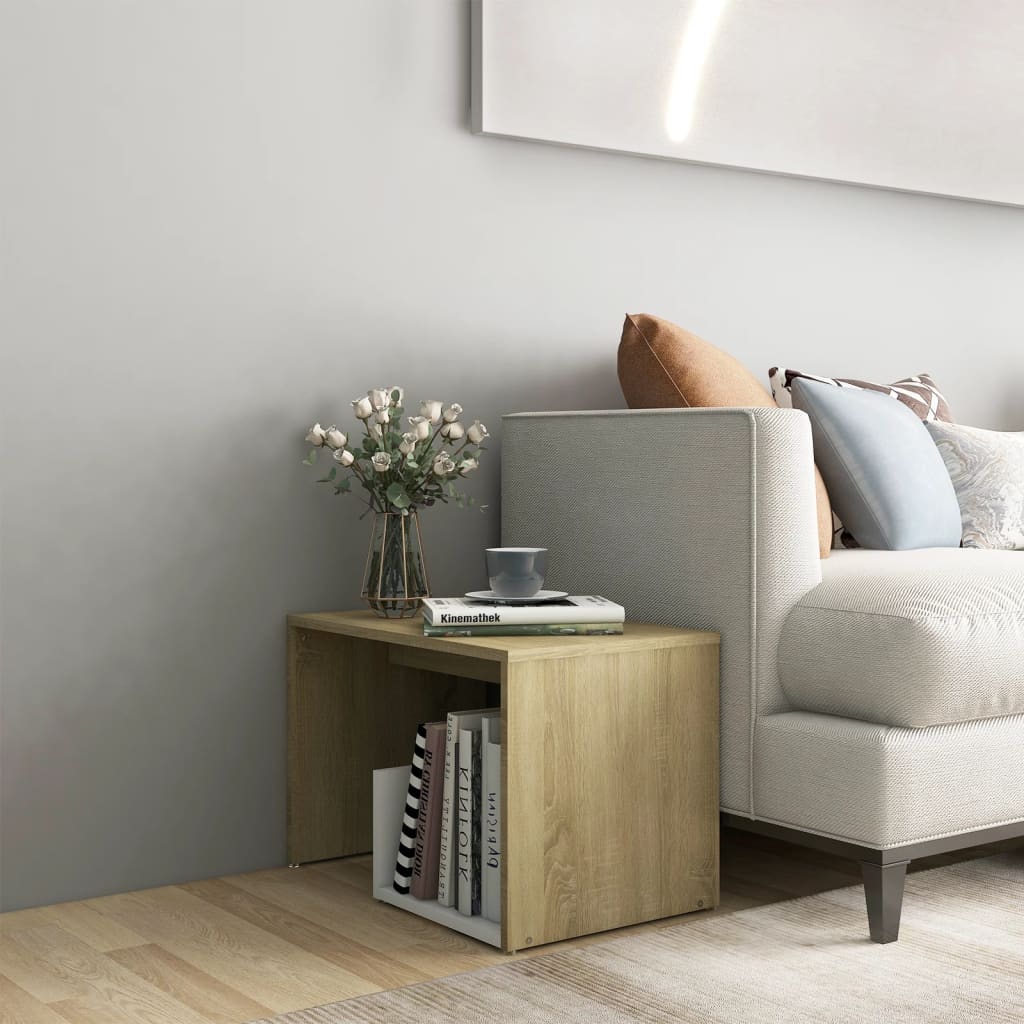 Lisää modernia tunnelmaa sisustukseesi tällä trendikkäällä ja käytännöllisellä sivupöydällä. Tässä sohvapöydässä on reilusti tilaa tärkeiden tavaroiden hyvässä järjestyksessä ja käden ulottuvilla pitämiseen. Pöytälevy tarjoaa vakaan pinnan, jolle voit asettaa juomat, kirjat ja koriste-esineet. Päätypöydän puhdistus käy helposti kostealla liinalla. Väri: valkoinen ja Sonoma-tammi Materiaali: lastulevy Mitat: 59 x 36 x 38 cm (L x S x K) Asennus vaaditaan: kyllä Huomio: Seinään kiinnitettävät ruuvit ja tulpat eivät sisälly toimitukseen. Etsi ja käytä seinääsi sopivia ruuveja ja tulppia. Jos olet epävarma, kysy ammattilaisen neuvoa. Lue ja seuraa asennusohjeiden jokaista vaihetta huolella.