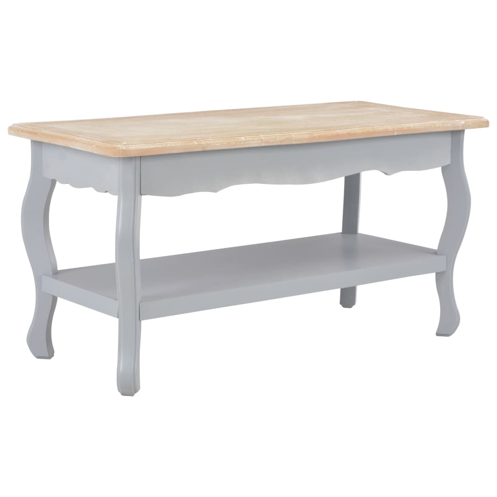 Klassinen puusta valmistettu sohvapöytä on ajaton lisä sisustukseen. Sohvapöytä on valmistettu MDF:stä ja täydestä mäntypuusta, mikä tekee siitä erittäin vahvan ja kestävän. Tämä 1 hyllyllä varustettu sohvapöytä tarjoaa runsaasti tilaa lehtien, kirjojen, kaukosäätimen ja muiden pienten esineiden pitämiseksi ulottuvillasi. Lisäksi muotoilu lisää ranskalaistyylistä ilmettä. Koristepöytä on helppo koota. Väri: harmaa ja ruskea Materiaali: MDF ja täysi mäntypuu Mitat: 87,5 x 42 x 44 cm (P x L x K) Sisältää yhden hyllyn Ranskalaistyylinen