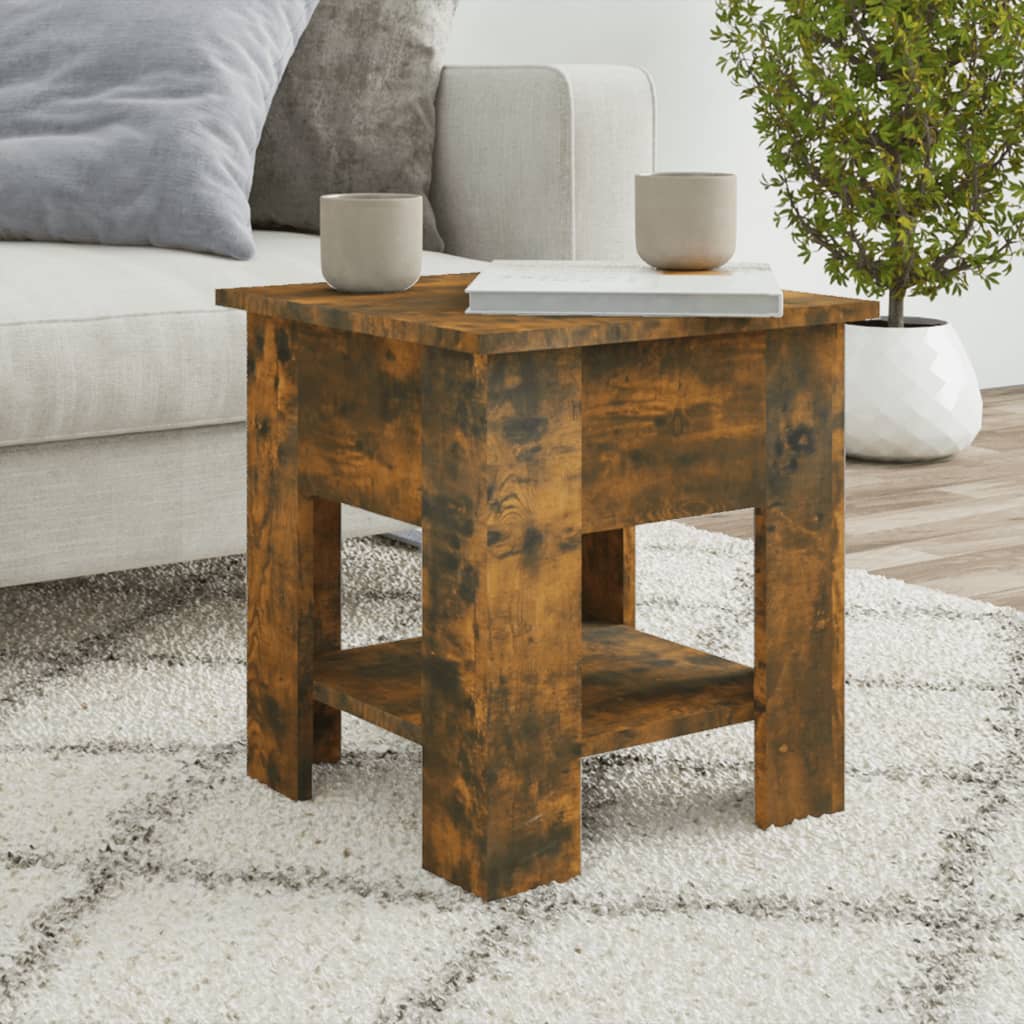 Tämä tyylikäs sohvapöytä edustaa modernia muotoilua ja se on käytännöllinen lisä elintiloihisi. Sivupöytä auttaa pitämään kotisi siistinä siinä olevan säilytyshyllyn ansiosta, joihin voit asettaa kirjat, aikakauslehdet ja pikkutavarat, jotka haluat pitää kätesi ulottuvilla. Lujalle pöytälevylle voi asettaa juomia, ruokia ja koriste-esineitä. Olohuoneen pöytä on helppo puhdistaa kostealla liinalla. Väri: savutammi Materiaali: tekninen puu Mitat: 40 x 40 x 42 cm (L x S x K) Asennus vaaditaan: kyllä