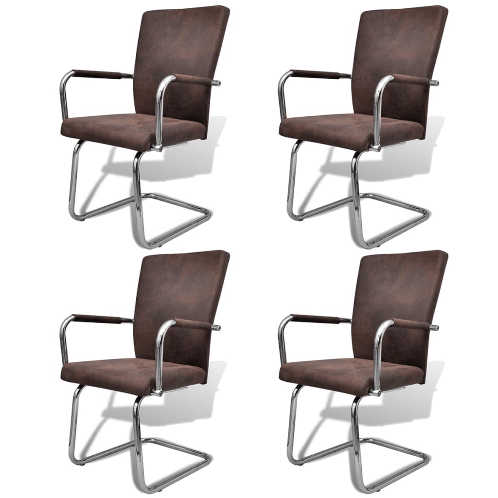 Tämä sulavalinjainen, modernisti muotoiltu cantilever ruokailutuolisarja soveltuu mihin tahansa keittiöön tai ruokailuhuoneeseen. Niiden paksusti pehmustetun istuimen ja selkänojan ansiosta, nämä keinonahkaiset tuolit ovat erittäin mukavat istua. Tuolien jalat on valmistettu kestävästä kromatusta raudasta, joka voidaan puhdistaa helposti. Nämä kauniit tuolit ovat nykyaikaiset, mutta ajattomat. Helppo koota. Toimitus sisältää 4 keinonahka tuolia. Väri: ruskea Materiaali: keinonahka + kromattu rauta Mitat: 52 x 54 x 92 cm (L x S x K) Istuimen leveys: 46 cm Istuimen syvyys: 41 cm Istuimen korkeus maasta: 45 cm Helppo koota Toimitus sisältää 4 korkealaatuista tuolia
