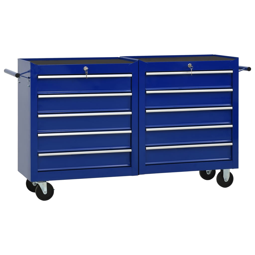 Käytä tätä tilavaa ja joustavaa työkalukärryä 10 vetolaatikolla varastoidaksesi ja järjestääksesi työkalusi. Tukevasta teräksestä valmistetussa verstaan työkalukärryssä on tukeva ja kestävä rakenne. Sisäänrakennettujen lukkojen ansiosta laatikot voidaan lukita kerralla ja estää niiden avautuminen vahingossa, kun kärryä siirretään. Jokaisessa laatikossa on liukumaton alusta, joka pitää työkalusi paikallaan. Tukeva pöytätaso on loistava paikka pitää usein käytettyjä työkaluja käden ulottuvilla. Kärryä voidaan siirtää helposti, sillä siinä on neljä rullapyörää, joista kahdessa on jarrut. Siinä on kaksi kätevää sivukahvaa kärryn työntämiseen. Toimitus sisältää myös avaimet ja kiinnitystarvikkeet. Väri: sininen Materiaali: teräs Kokonaismitat (renkaiden kanssa): 140 x 33 x 77,2 cm (P x L x K) Vetolaatikoiden mitat (kukin): 51 x 29 x 10 cm (L x S x K) Sisältää 10 vetolaatikkoa Sisältää 2 kahvaa Sisältää hopeanväriset EVA-kuulalaakeriliukukiskot Lukittavissa Naarmuuntumaton pinta kestävä rakenne Sisältää 4 rullapyörää (joista 2 jarrulla) Asennus vaaditaan: kyllä