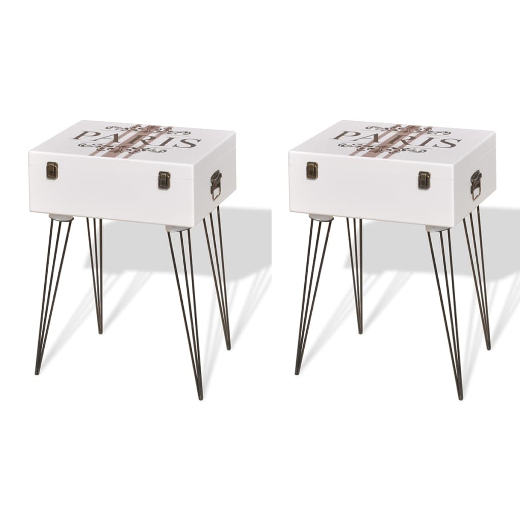 Nämä erikoiset yöpöydät on suunniteltu matkalaukun muotoon ja niitä voidaan käyttää myös puhelinpöytänä. Nämä sivupöydät ovat käytännöllinen sekä erittäin koristeellinen lisä olohuoneeseesi, oleskelutilaasi tai makuuhuoneeseesi. Suorakaiteen muotoiset pöytätasot ovat ihanteellinen paikka laittaa esille koriste-esineitä, valokuvakehyksiä tai jopa ruukkukasveja, matkalaukkujen sisällä on runsaasti säilytystilaa pitääksesi kaikki pienemmät tavarat järjestyksessä ja lähettyvillä. Laadukkaasta MDF:stä valmistetut matkalaukun muotoiset päätypöydät ovat todella kestävät ja vakaat. Todella helppo koota. Toimitus sisältää 2 yöpöytää Väri: valkoinen Materiaali: MDF ja teräsjalat Kokonaismitat: 40 x 30 x 57 cm (L x S x K) Voidaan käyttää myös puhelinpöytinä Toimitus sisältää 2 yöpöytää