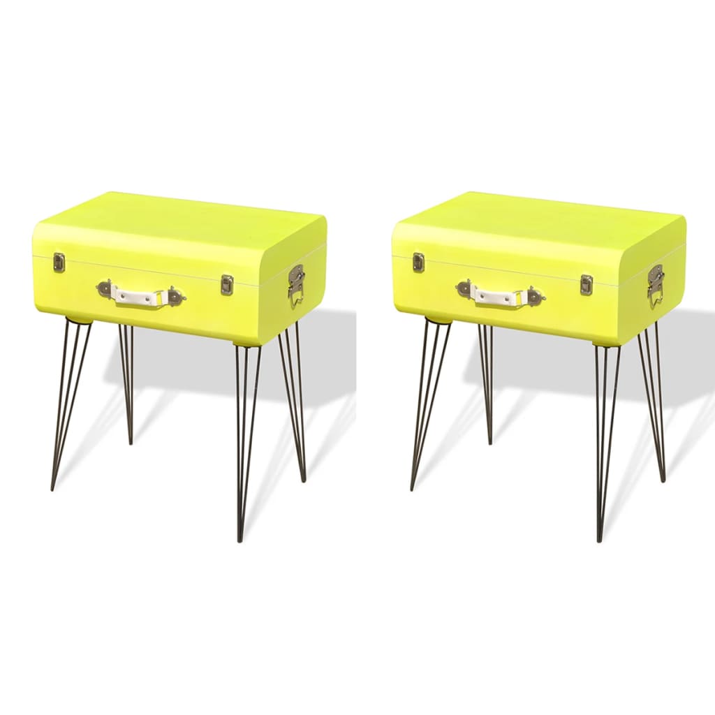 Nämä erikoiset yöpöydät on suunniteltu matkalaukun muotoon ja niitä voidaan käyttää myös puhelinpöytänä. Nämä sivupöydät ovat käytännöllinen sekä erittäin koristeellinen lisä olohuoneeseesi, oleskelutilaasi tai makuuhuoneeseesi. Suorakaiteen muotoiset pöytätasot ovat ihanteellinen paikka laittaa esille koriste-esineitä, valokuvakehyksiä tai jopa ruukkukasveja, matkalaukkujen sisällä on runsaasti säilytystilaa pitääksesi kaikki pienemmät tavarat järjestyksessä ja lähettyvillä. Laadukkaasta MDF:stä valmistetut matkalaukun muotoiset päätypöydät ovat todella kestävät ja vakaat. Todella helppo koota. Toimitus sisältää 2 yöpöytää Väri: keltainen Materiaali: MDF ja teräsjalat Kokonaismitat: 49,5 x 36 x 60 cm (L x S x K) Voidaan käyttää myös puhelinpöytinä Toimitus sisältää 2 yöpöytää