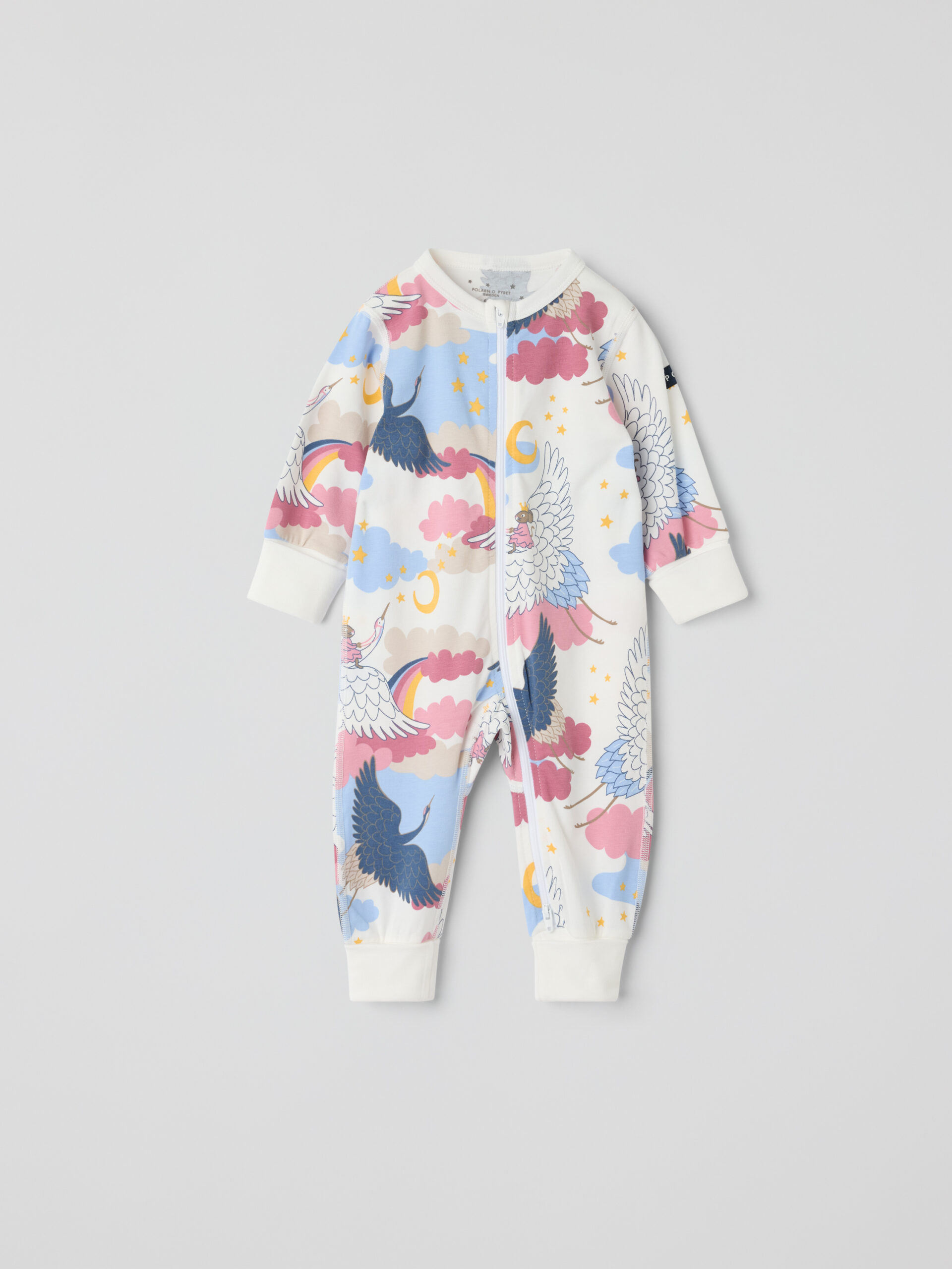 Pyjamahaalari pehmeää luomupuuvillaa. Erittäin pehmeät ja litteät saumat, jotka eivät hankaa herkkää ihoa. Hihan- ja lahkeensuissa erityispitkät resorit, jotka voi taittaa alas lapsen kasvaessa. Pitkä vetoketju pääntieltä lahkeensuulle voidaan avata ylhäältä tai alhaalta, mikä helpottaa pukemista.